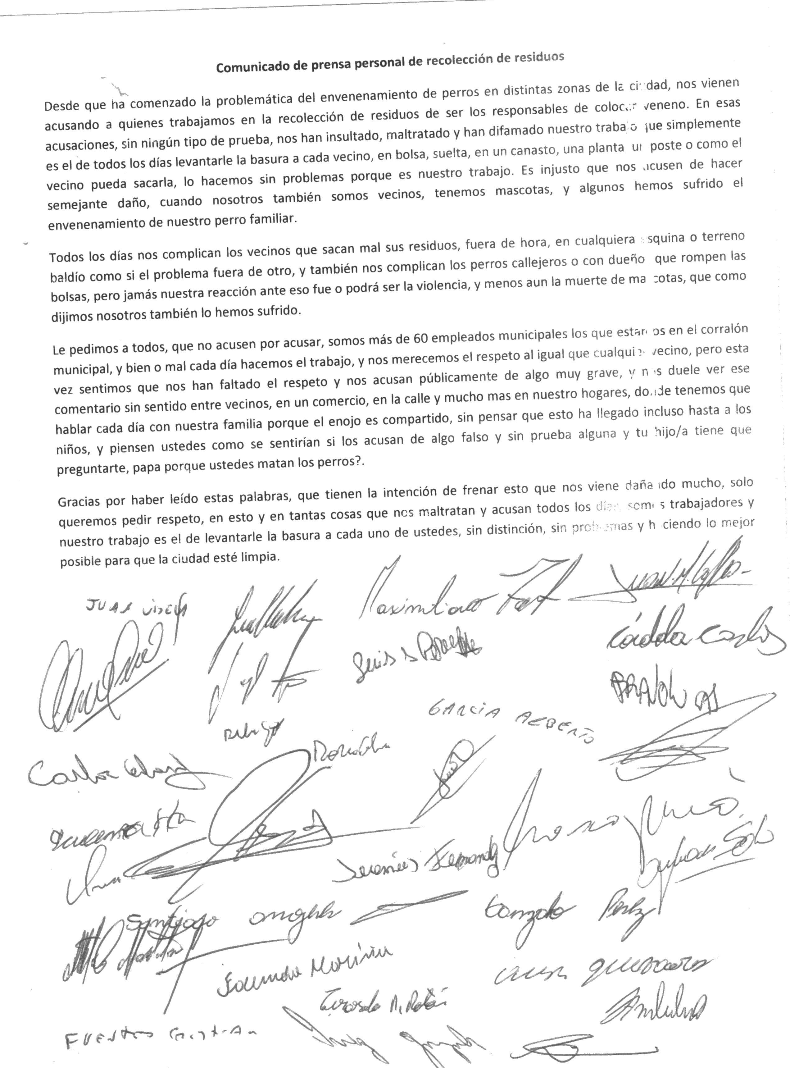 Trabajadores del área de Recolección de Residuos de la comuna, emitieron un comunicado en donde niegan todo tipo de responsabilidad ante las acusaciones sobre los perros envenenados que han aparecido últimamente en distintos sectores de la ciudad. El comunicado dice lo siguiente:
