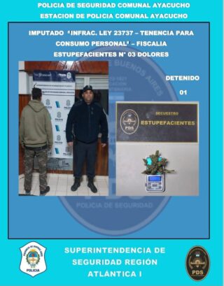 Continuando con los distintos controles, se procedió a infraccionar en el marco de la ley 23737 (tenencia simple, consumo personal) a dos sujetos, mayores de edad, los cuales llevaban frascos cuyo interior tenía hojas de picadura de marihuana. Ambos sujetos fueron notificados de formación de la causa.