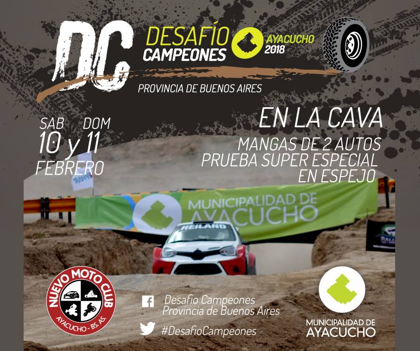 Ya se empezaron a transitar los días previos a la competencia Desafío de Campeones de Rally, que organizan el Municipio de Ayacucho y el Nuevo Moto Club, junto a las autoridades del Rally Mar y Sierras que pondrán en escena un evento que promete ser fantástico, a desarrollarse en la Cava Municipal el Sábado 10 y Domingo 11 de Febrero, con entrada libre y gratuita.