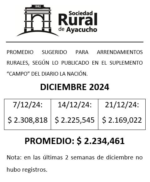 Promedio sugerido para arrendamientos rurales – Diciembre de 2024 2 enero, 2025 Pablo Tusq Campo, campo DIA, destacados 0 X