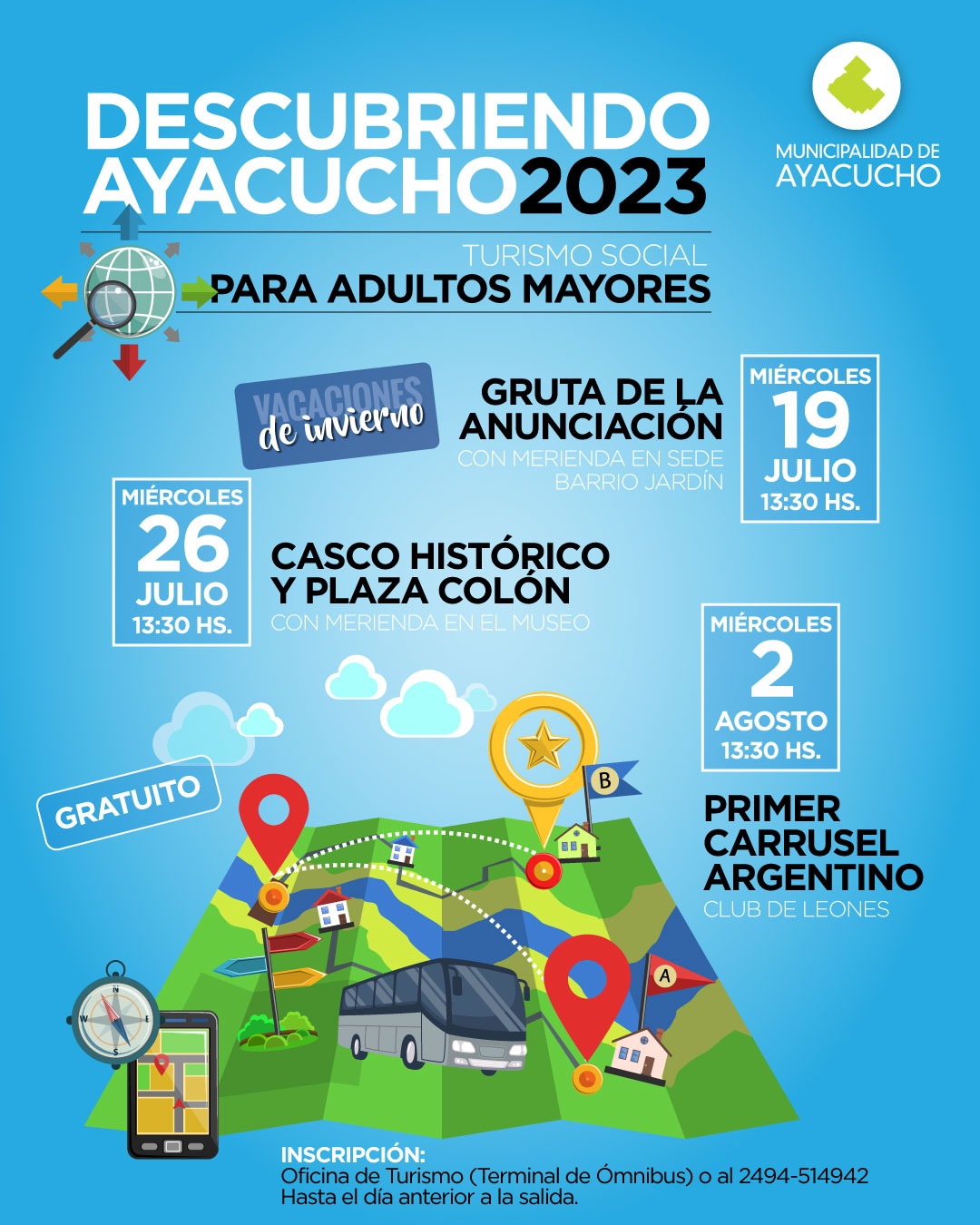 Puede ser una imagen de mapa y texto que dice "MUNICIPALIDAD DE AYACUCHO DESCUBRIENDO AYACUCHO2023 TURISMO SOCIAL PARA ADULTOS MAYORES de GRUTA MIÉRCOLES ANUNCIACIÓN 19 MERIENDA EN SEDE BARRIO JARDIN JULIO 13:30 HS. MIÉRCOLES 26 JULIO 13:30 HS. CASCO HISTÓRICO YPLAZA COLON MERIENDA ENE MUSEO GRATUITO MIÉRCOLES 2 AGOSTO 13:30 HS. B H PRIMER CARRUSEL ARGENTINO CLUB DE LEONES INSCRIPCIÓN: Oticinade Turismo (Terminal de Ãmnibus) al 2494-514942 Hasta día anterior salida."