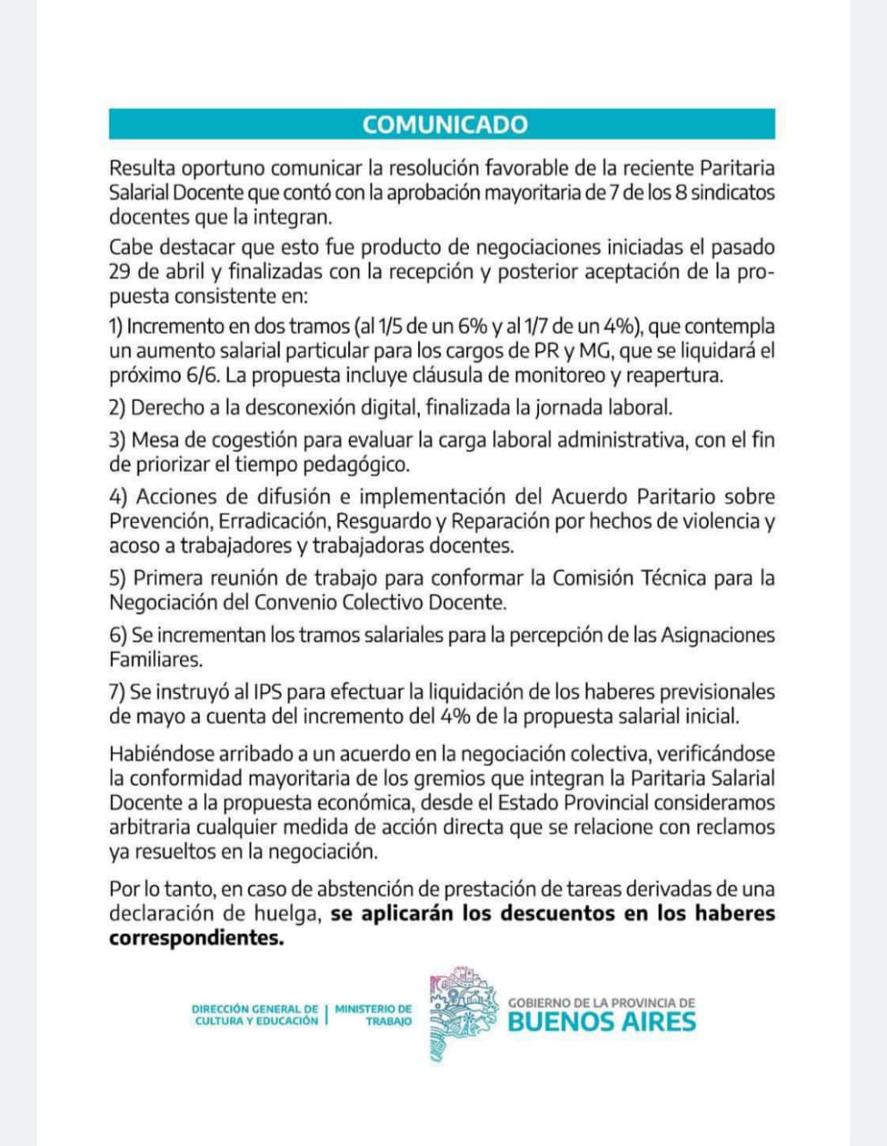Y teniendo en cuenta que se “verificó la conformidad mayoritaria de los gremios que integran la Paritaria Salarial Docente a la propuesta económica, desde el Estado Provincial consideramos arbitraria cualquier medida de acción directa que se relacione con reclamos ya resueltos en la negociación. Por lo tanto, en caso de abstención de prestación de tareas derivadas de una declaración de huelga, se aplicarán los descuentos en los haberes correspondientes”.