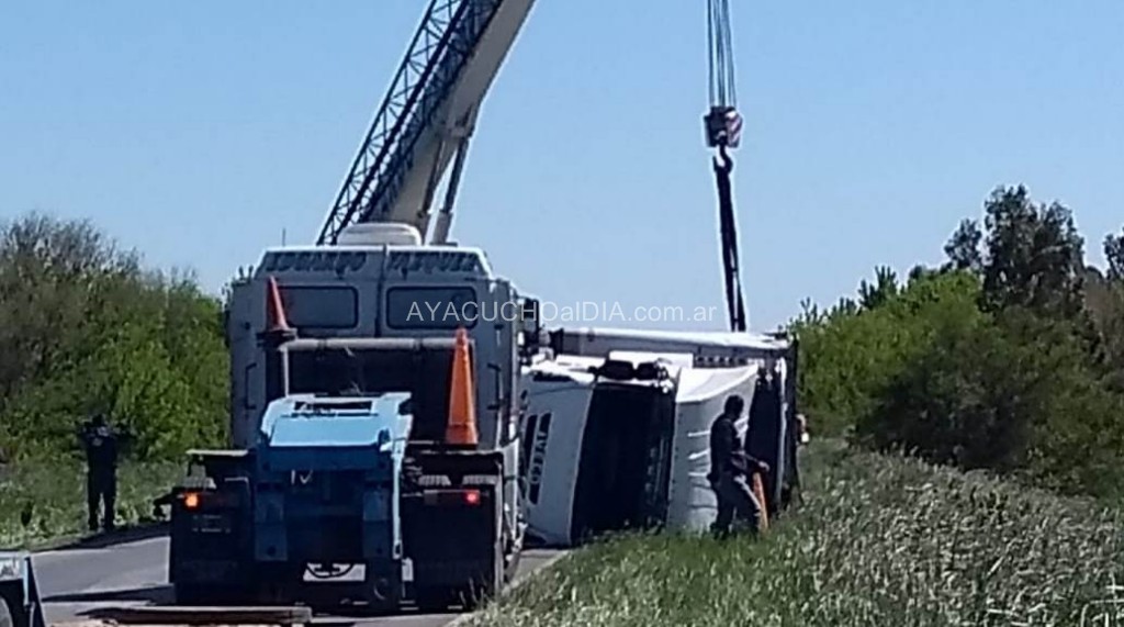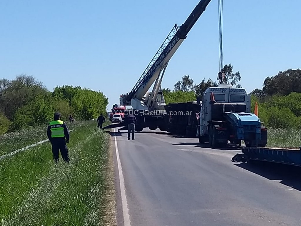 Las tareas de poner sobre sus ruedas al pesado transporte fueron llevadas a cabo por la empresa de grúas «Edgardo Vázquez» que utilizó una pesada pluma para poder girar el vehículo y liberar la zona, justamente en una parte estrecha como consecuencia del puente del arroyo.