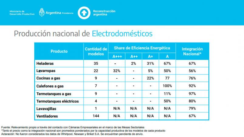 El programa incluye 35 modelos de heladeras, 22 de lavarropas, 9 de cocinas, 9 de termotanques, 7 de calefones, 4 de termotanques eléctricos, 1 de lavavajillas y 144 de ventiladores. Todos los productos que podrán adquirirse con esta línea de crédito tienen un nivel de integración nacional superior al 55% y llegan a ser un 97% nacionales como el caso de los termotanques a gas.