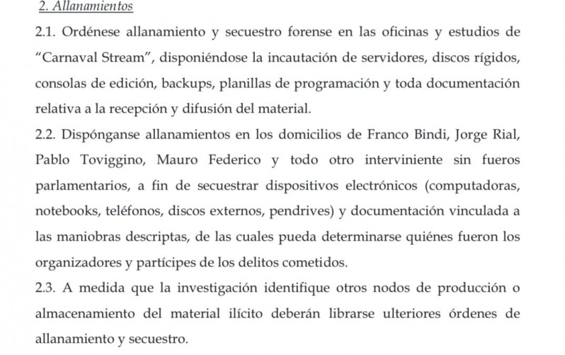 Además, pide allanamientos en los domicilios de los periodistas Jorge Rial y Mauro Federico, del abogado Franco Bindi y del empresario Pablo Toviggino. A ellos solicita que se les secuestren dispositivos electrónicos y documentación.