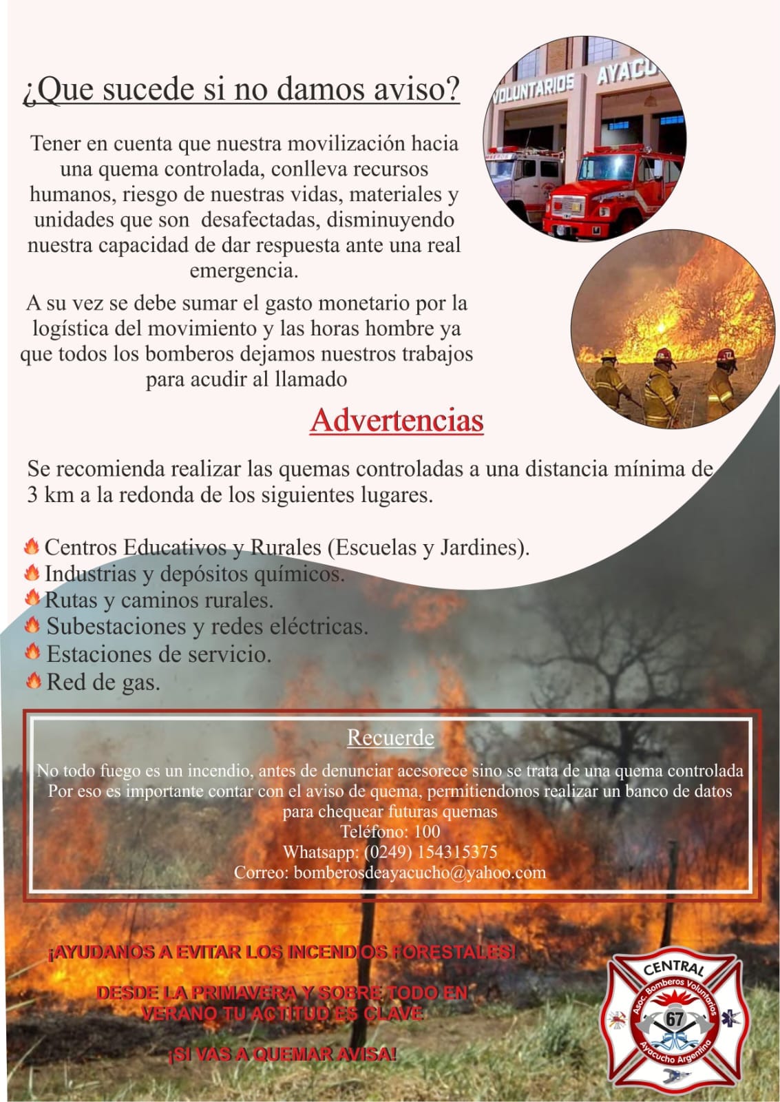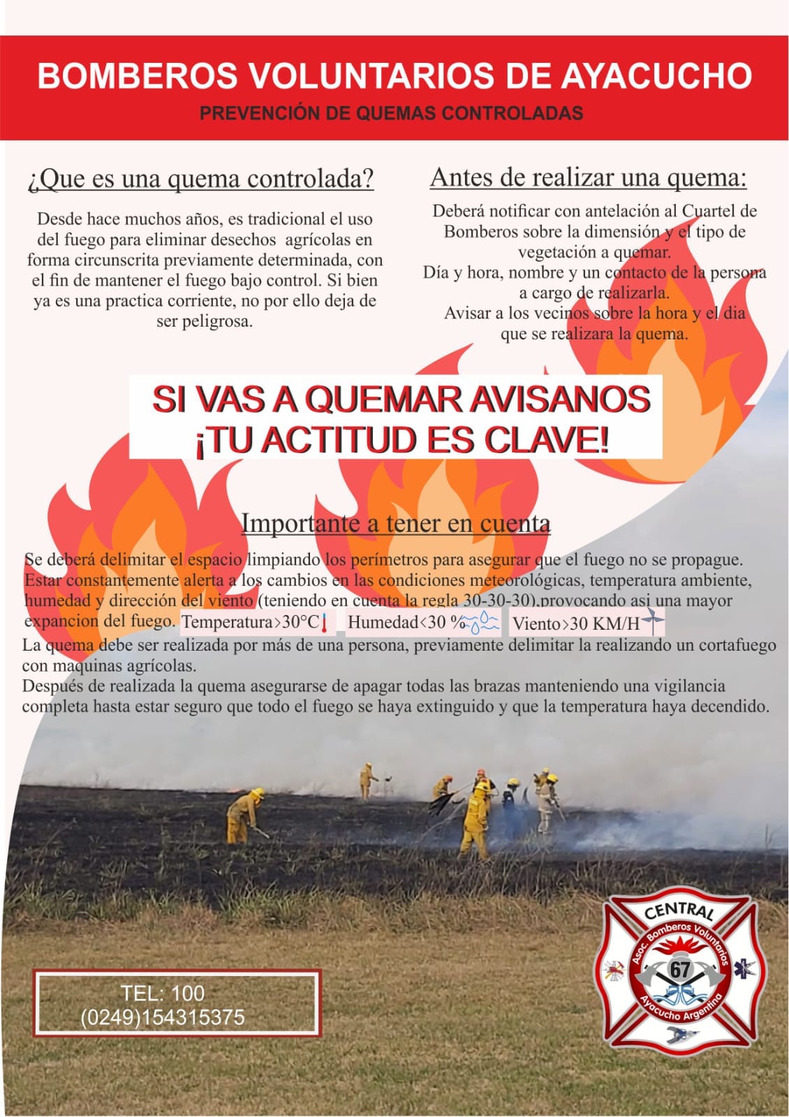 La Asociación de Bomberos Voluntarios y la Municipalidad de Ayacucho brindaron detalles acerca del protocolo de actuaciones para quemas controladas en el distrito, enmarcado en la Ordenanza 5811/2022 correspondiente al programa de prevención y manejo de incendios forestales.