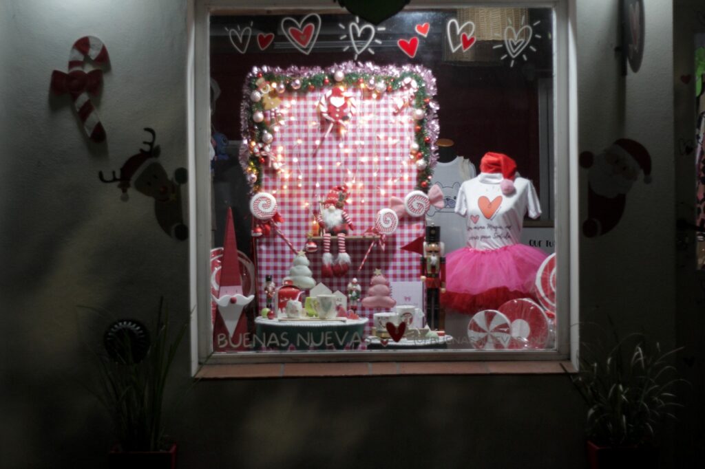 En cuanto a Buenas Nuevas, se valoró el aprovechamiento total de la vidriera, la paleta de colores elegida en sintonía con la identidad y el logo del local, y el uso de estampas en diferentes escalas que lograban contrastes sin perder armonía. La composición de múltiples elementos navideños, muchos de ellos a la venta, invitaba a detenerse y observar cada detalle, generando el deseo de adquirirlos. También se destacó la intervención de la fachada con dibujos navideños, que aportaron a la propuesta integral.