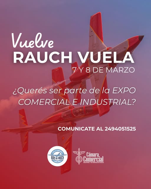 Rauch Vuela 2026 / Será los días 7 y 8 de Marzo 26 enero, 2026 Pablo Tusq destacados, Zonales y Regionales 0 Rauch Vuelva 2026 Querés participar en la Expo comercial e industrial? Te damos toda la información y te inscribimos. Comunícate al 2494 051525. #rauchvuela #camaracomercialrauch #expocomercialeindustrial X