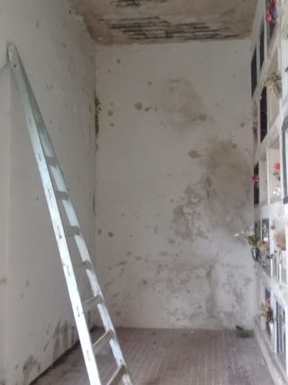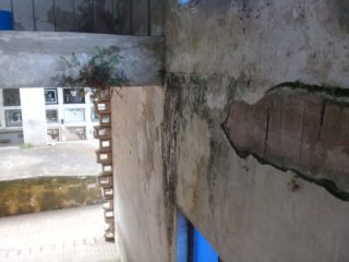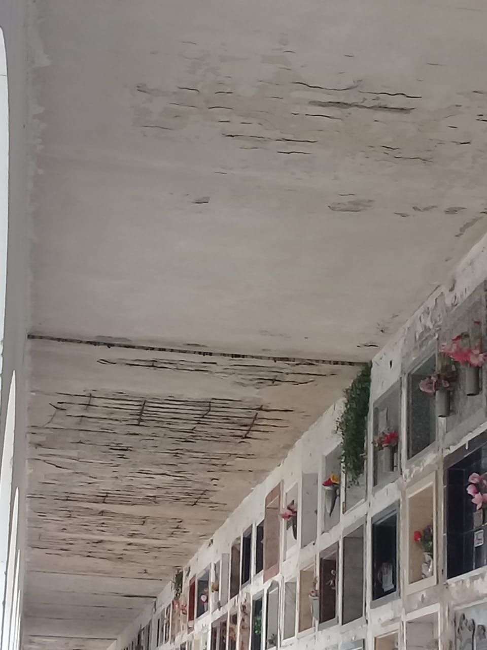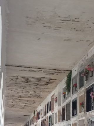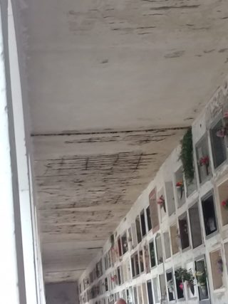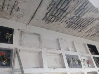 Pasillos con cielorrasos colapsados, sin iluminación, con falta de limpieza y mantenimiento de los tragaluces, techos rotos con riesgo de derrumbe; presencia de aves que dejan sus excrementos sobre los nichos; agua estancada en los lavatorios, son algunas de las deficiencias observadas.