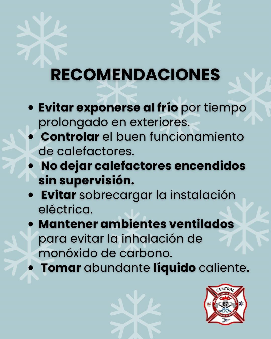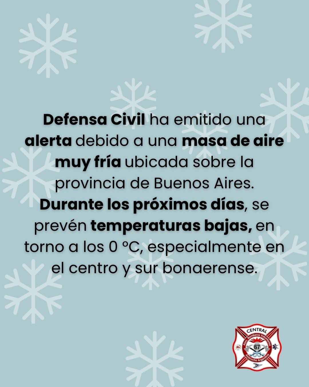 Recomendaciones de Bomberos y Defensa Civil por las bajas temperaturas 30 junio, 2025 Pablo Tusq destacados, Sociales 0 Defensa Civil ha emitido una alerta por bajas temperaturas afectando nuestra zona. Te dejamos recomendaciones a tener en cuenta; Ante cualquier emergencia comunícate; 100 | 107 | 911 X
