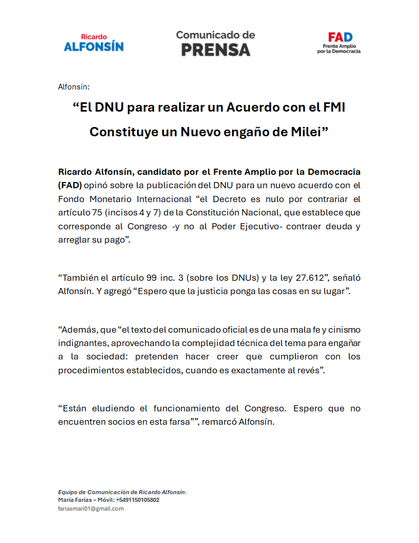 Ricardo Alfonsín, candidato por el Frente Amplio por la Democracia (FAD) opinó sobre la publicación del DNU para un nuevo acuerdo con el Fondo Monetario Internacional “el Decreto es nulo por contrariar el artículo 75 (incisos 4 y 7) de la Constitución Nacional, que establece que corresponde al Congreso -y no al Poder Ejecutivo- contraer deuda y arreglar su pago”.