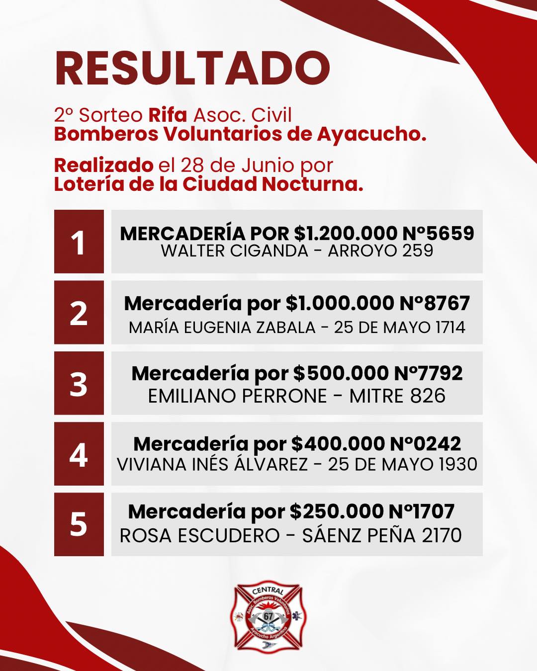Compartimos el resultado del 2° Sorteo Rifa Asoc. Civil Bomberos Voluntarios de Ayacucho, realizado este sábado 28 de Junio por Lotería de la Ciudad Nocturna. Gracias a todos por colaborar.
