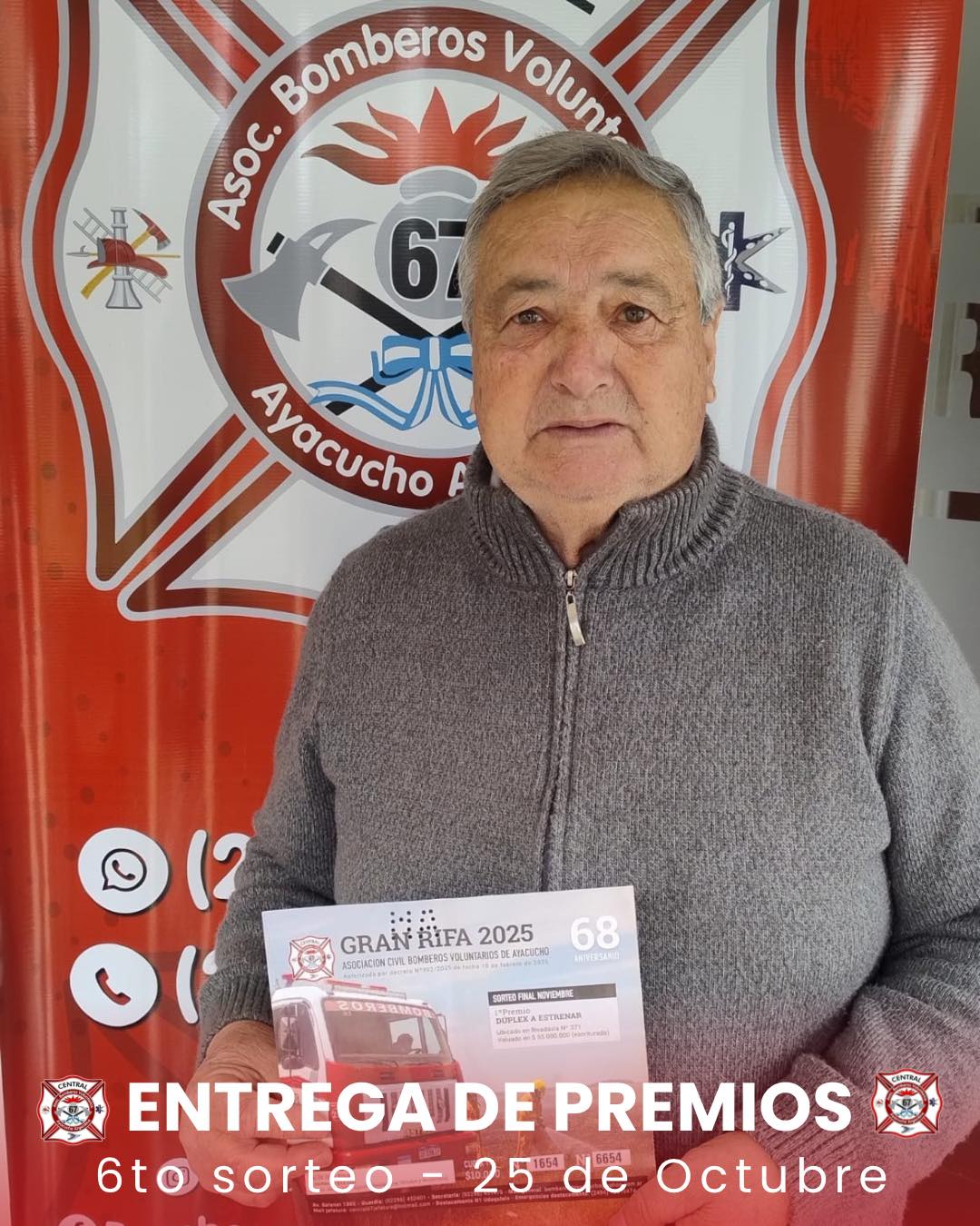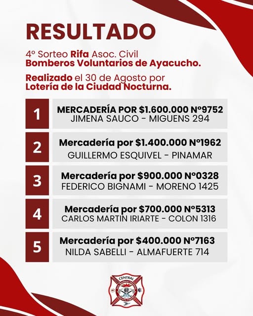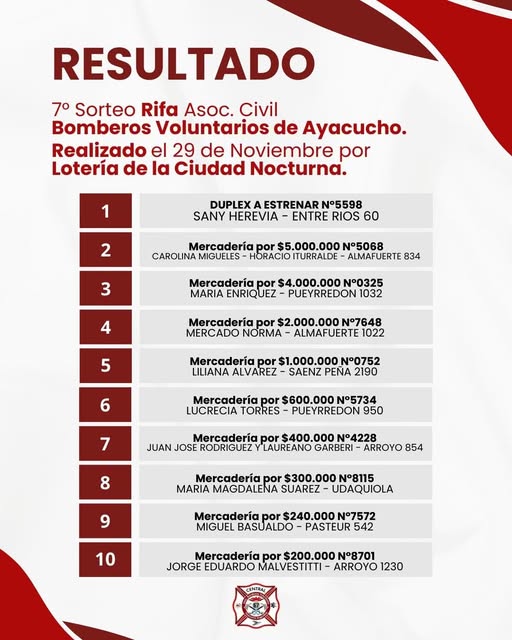 Les compartimos el resultado del 7° Sorteo Rifa Asociación Civil Bomberos Voluntarios de Ayacucho.