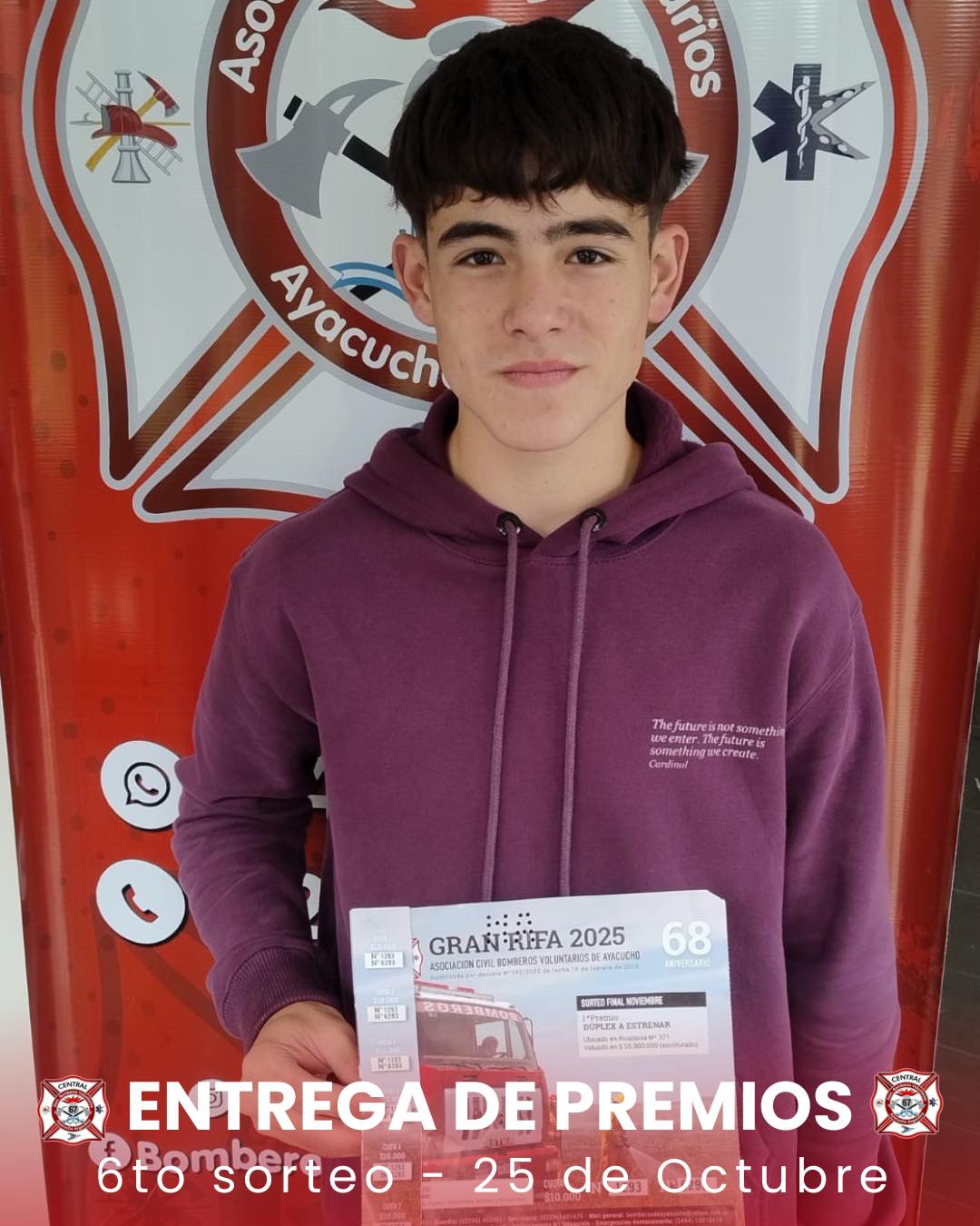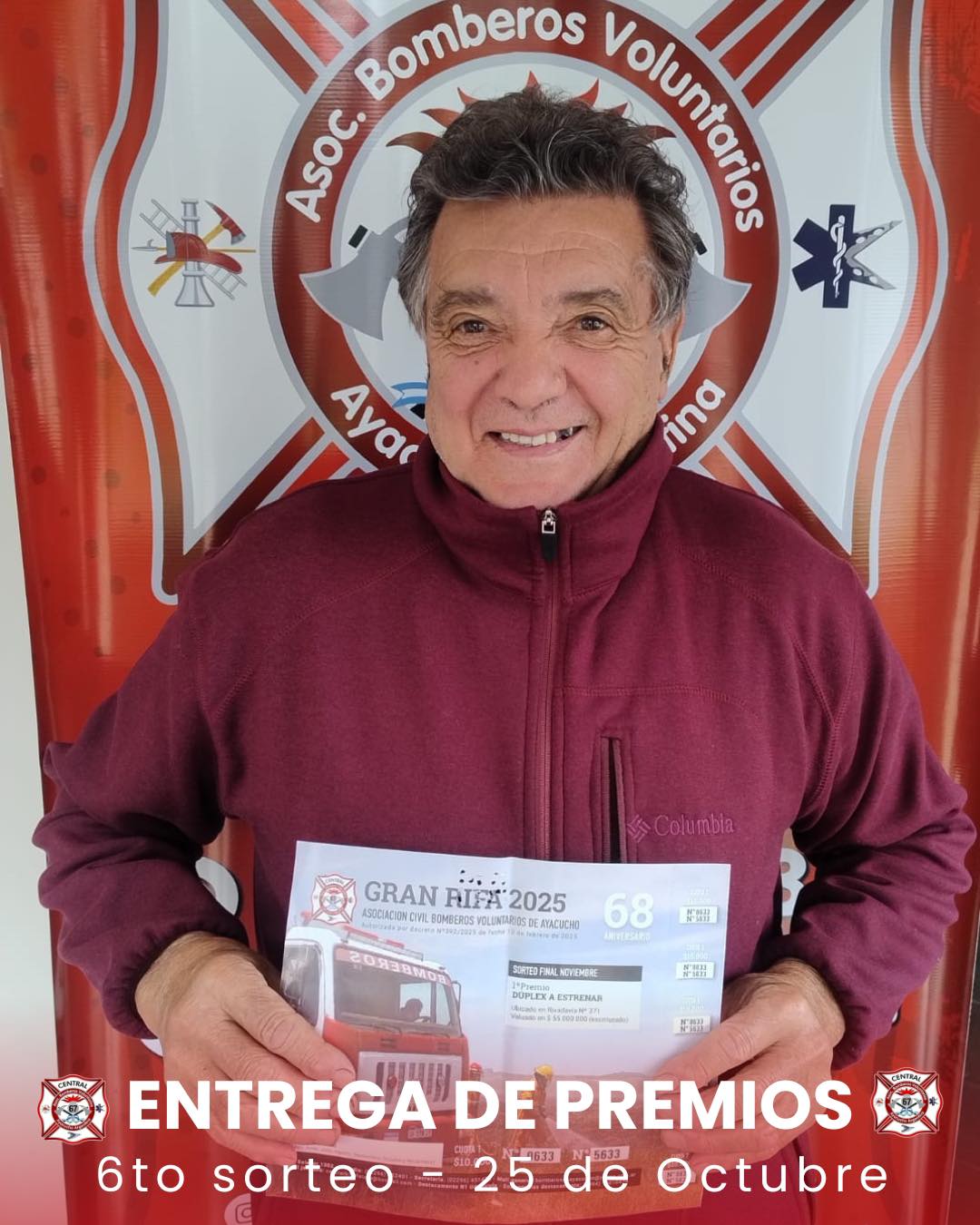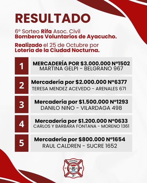 Les compartimos el resultado del 6° Sorteo Rifa Asociación Civil Bomberos Voluntarios de Ayacucho. Fue realizado el sábado 25 de Octubre por Lotería de la Ciudad Nocturna. Gracias a todos por colaborar.