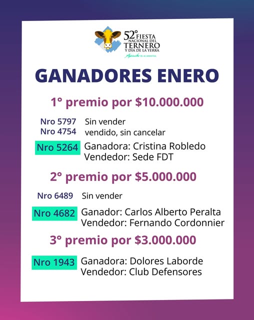 * 2do premio $5.000.000: 4682 ganador Carlos Alberto Peralta (Vendió Fernando Coordonier)