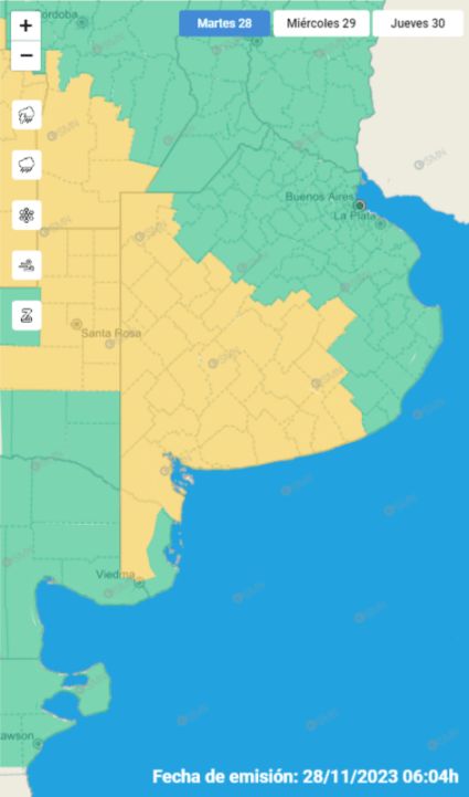 El Servicio Meteorológico Nacional (SMN) ha emitido una alerta amarilla para este martes 28 de noviembre en gran parte de la provincia de Buenos Aires, advirtiendo sobre la posibilidad de fuertes tormentas que podrían afectar diversas zonas.