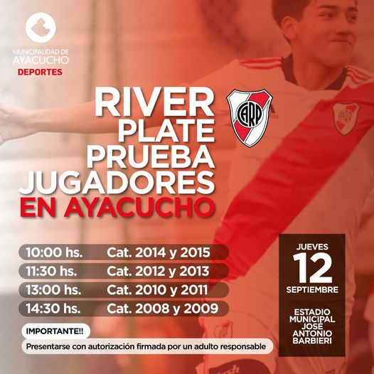 Este jueves 12 de Septiembre llegará el Club Atlético River Plate a nuestra ciudad, para realizar una jornada de prueba y captación de jugadores categoría 2014 a 2009.