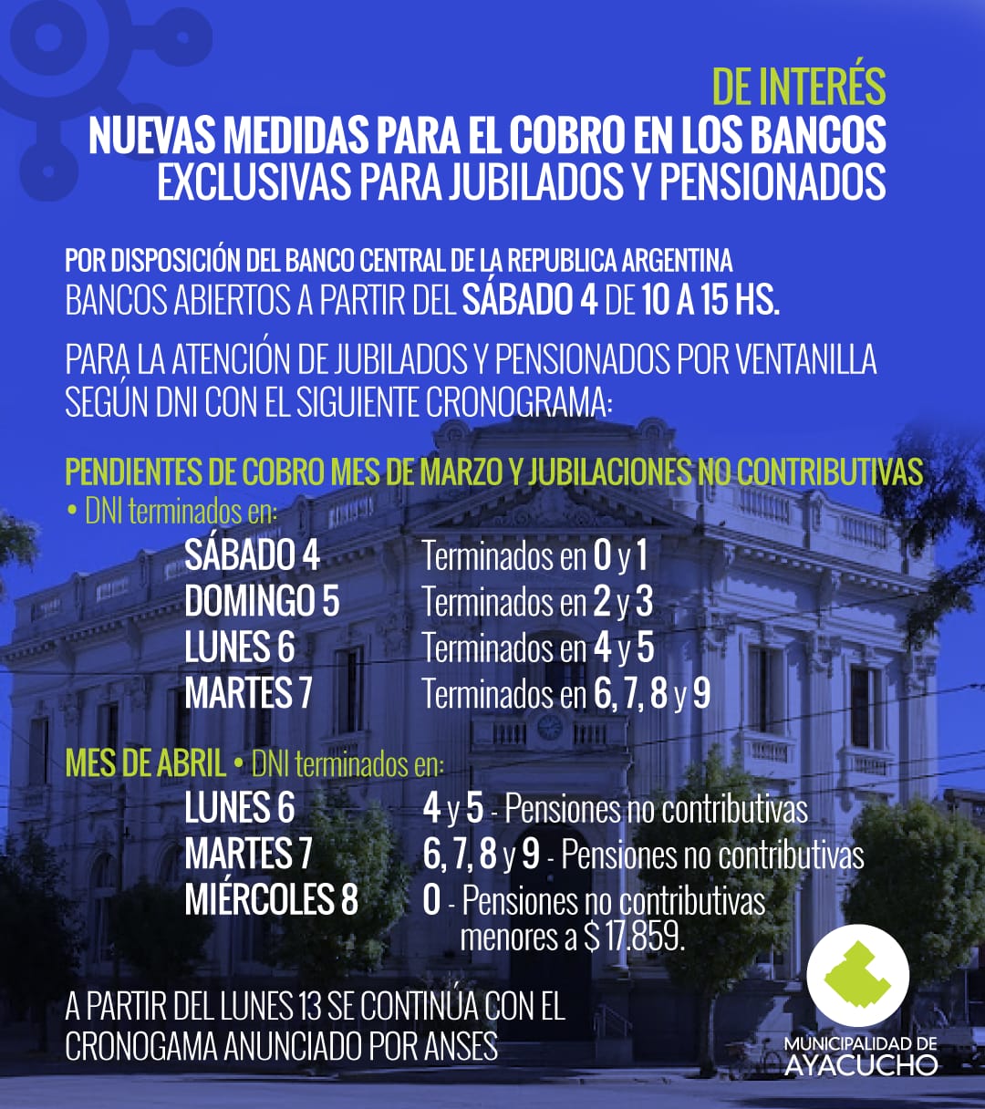La información oficial menciona que atenderán exclusivamente a jubilados y pensionados por ventanilla con DNI terminados según el siguiente cronograma: