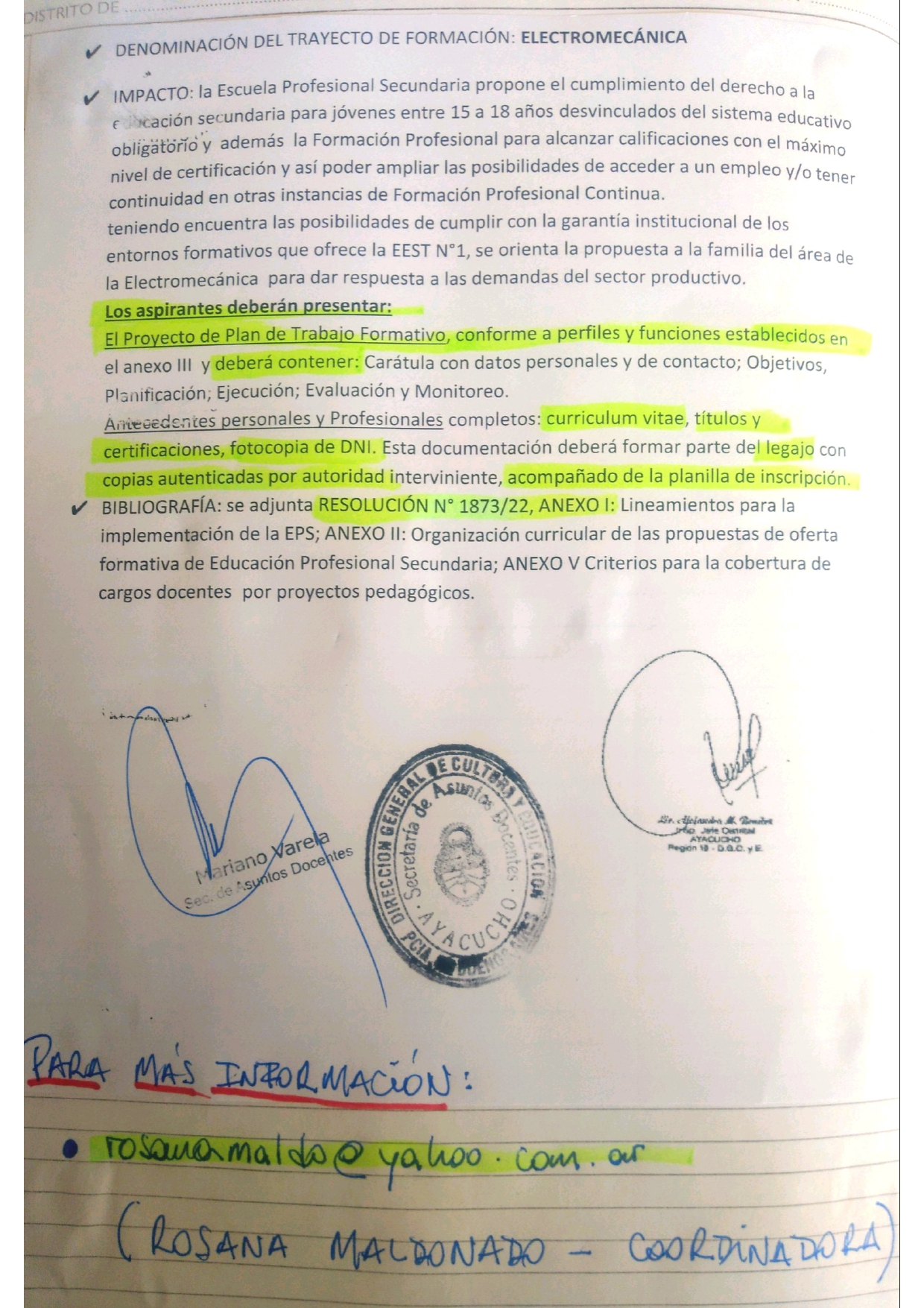 SAD da a conocer información sobre la presentación de proyectos para áreas de la nueva ESCUELA SECUNDARIA PROFESIONAL ORIENTACION: ELECTROMECANICA.