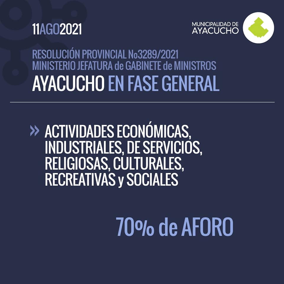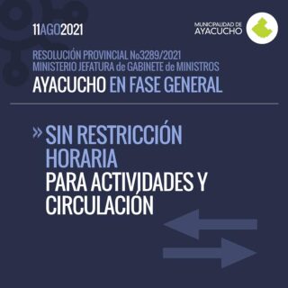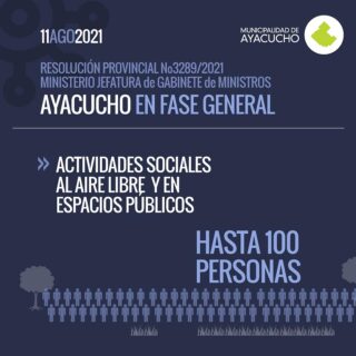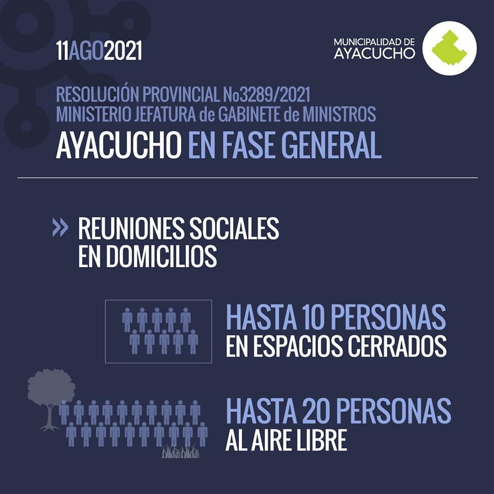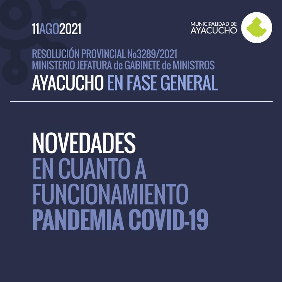 Por disposición de la Provincia de Buenos Aires y teniendo en cuenta la mejora en la situación epidemiológica que se viene registrando en todo el territorio bonaerense y en donde Ayacucho no escapa a la regla, se abandonó el sistema de Fases que se había impuesto desde el inicio de la pandemia, y con ello llega de la mano una cierta apertura a más actividades, con menores restricciones que ilusionan pero que también nos obligan a reforzar los cuidados que debemos seguir teniendo.