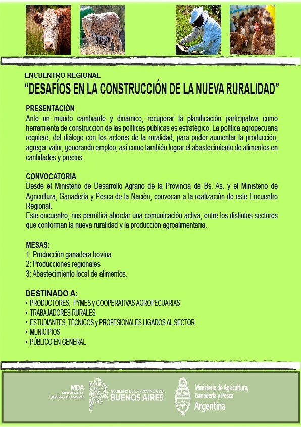 El venidero martes 17 de Mayo se concretará el Encuentro Regional “Desafíos en la construcción de la nueva ruralidad”, que se llevará a cabo en la Colonia Ortiz Basualdo, desde las 9 hasta las 13 horas. La organización y convocatoria estará a cargo del Ministerio de Desarrollo Agrario de la Provincia de Bs. As. y el Ministerio de Agricultura, Ganadería y Pesca de la Nación, juntamente con la Dirección de Educación Agraria, Dirección Provincial de Educación Técnico Profesional – DPETP, dependiente de la Dirección General de Cultura y Educación.
