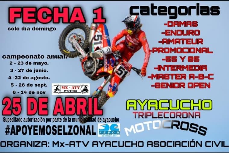 Ayacucho organizará el lanzamiento de la Triple Corona de Motocross. Será el 25 de Abril próximo, con actividad solo el domingo. Así lo anunciaron desde la organización por sus redes sociales.