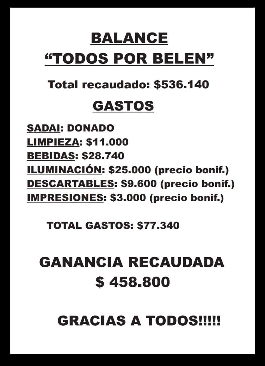 Hoy se muestran los números para que todos sepan que el granito de arena aportado sirvió. Esto va directo a Belén y a su salud… Gracias a los gestores de la idea y al pueblo que en las medidas de las posibilidades de cada uno ayudó Maria Lujan Jaime Eva Giachi Florencia Lamenza Patricia Reyes Jorgelina Suarez Ignacio Echeverria Lorena Estefania Irigoyen.