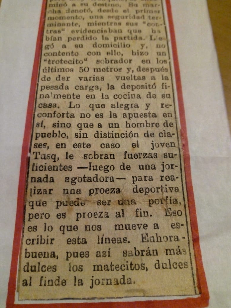 El diario “La Verdad” tituló entonces “Hazaña de un trabajador”. Y todo surgió, según dicen los que saben, por una apuesta de dos compañeros de trabajo. La distancia de 5 cuadras parecería poco, pero semejante peso, no era para cualquiera. Pero su tenacidad y fuerza de voluntad, lo hizo quedar en el recuerdo. Su desafiante Hernán Nelli, todo el pueblo lo valorizó como algo muy difícil de lograr nuevamente.
