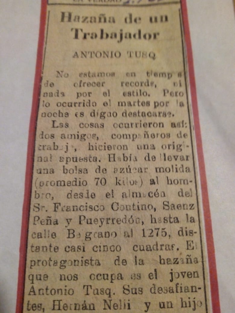 Pero volviendo a sus logros, una vez lo desafiaron a transportar una bolsa de 70 kg de azúcar molida, desde frente a lo que hoy es “Don Pancho” hasta su casa actual, allí en Belgrano 1275 casi Av. Miguens. Salió entonces desde el comercio de Don Francisco Contino, ubicado en S. Peña casi Dindart, llevando la pesada carga a pie, sobre sus hombros.