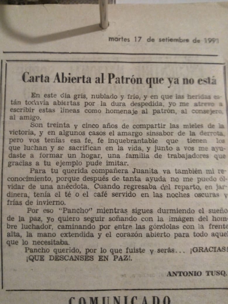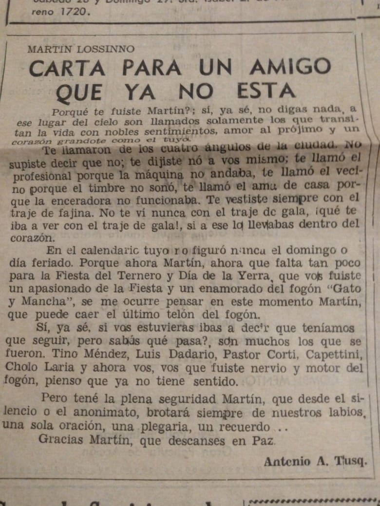Sus acciones particulares, su solidaridad, su hombría de bien, su entrega por las instituciones y su trabajo de años en «Don Pancho». El recuerdo en los relatos del TC en Tandil junto a mí papá Pablo. La época de los cucciolos y las carreras en el Cicles. El Fogón «Gato y Mancha» y el molino que sacaba vino gratis con el Nene Liuzzi y sus colaboradores. Las campañas y caravanas de los Reyes Magos con juguetes para los chicos del pueblo y sus visitas al Hospital municipal «Dr. Pedro Solanet»…