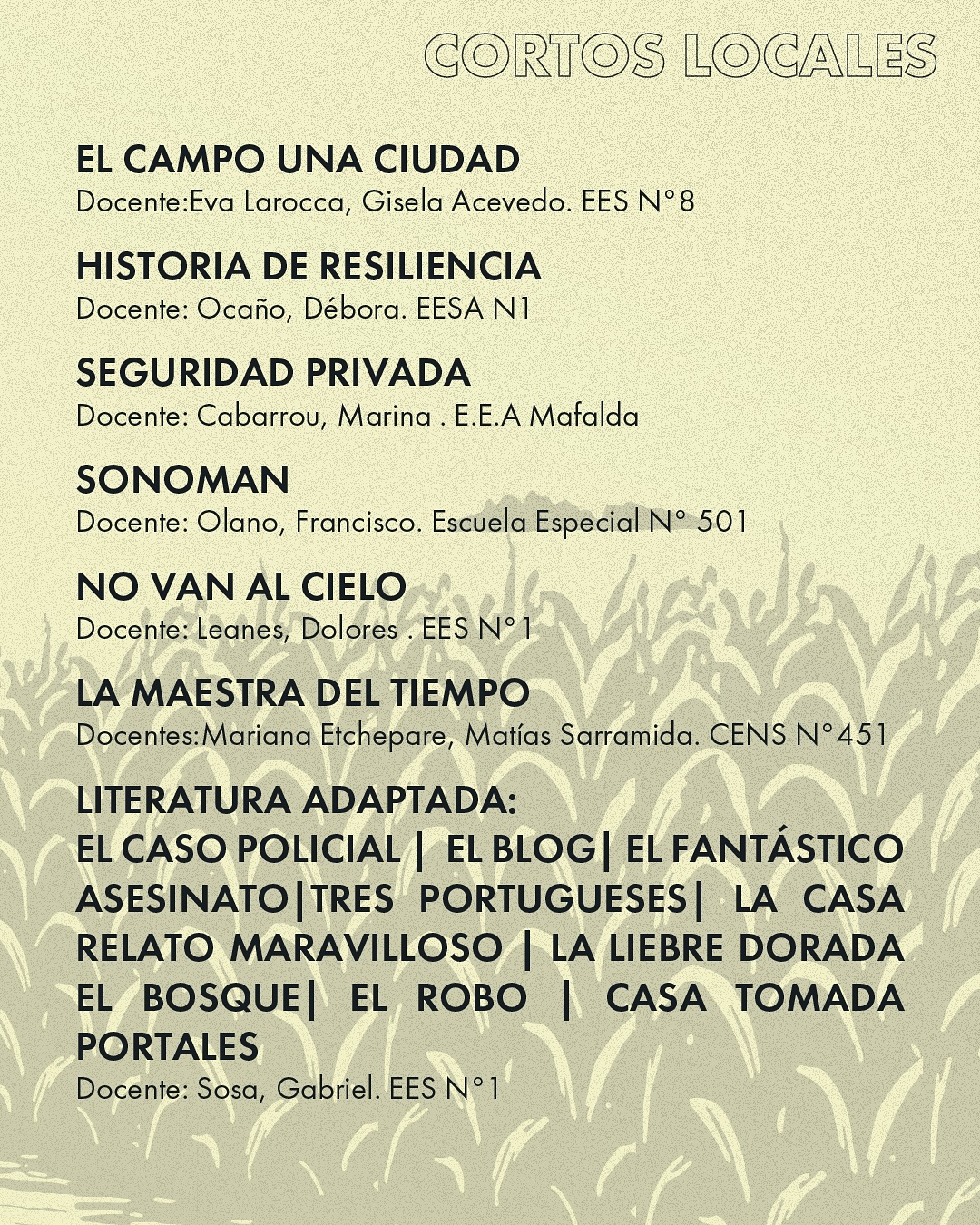 Con orgullo compartimos los cortometrajes seleccionados para competir en esta edición. Obras creadas por realizadores y realizadoras de nuestra ciudad, que reflejan talento, identidad y creatividad.