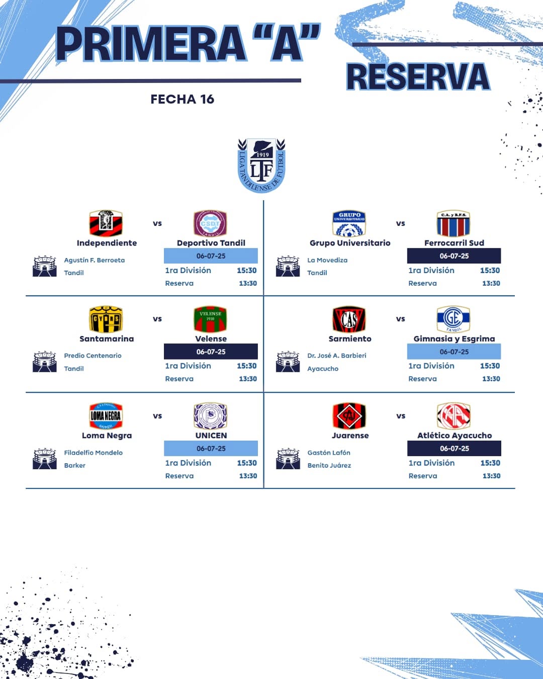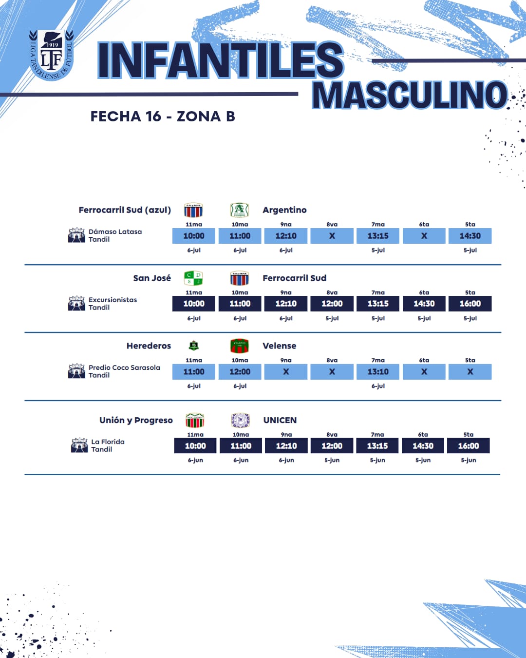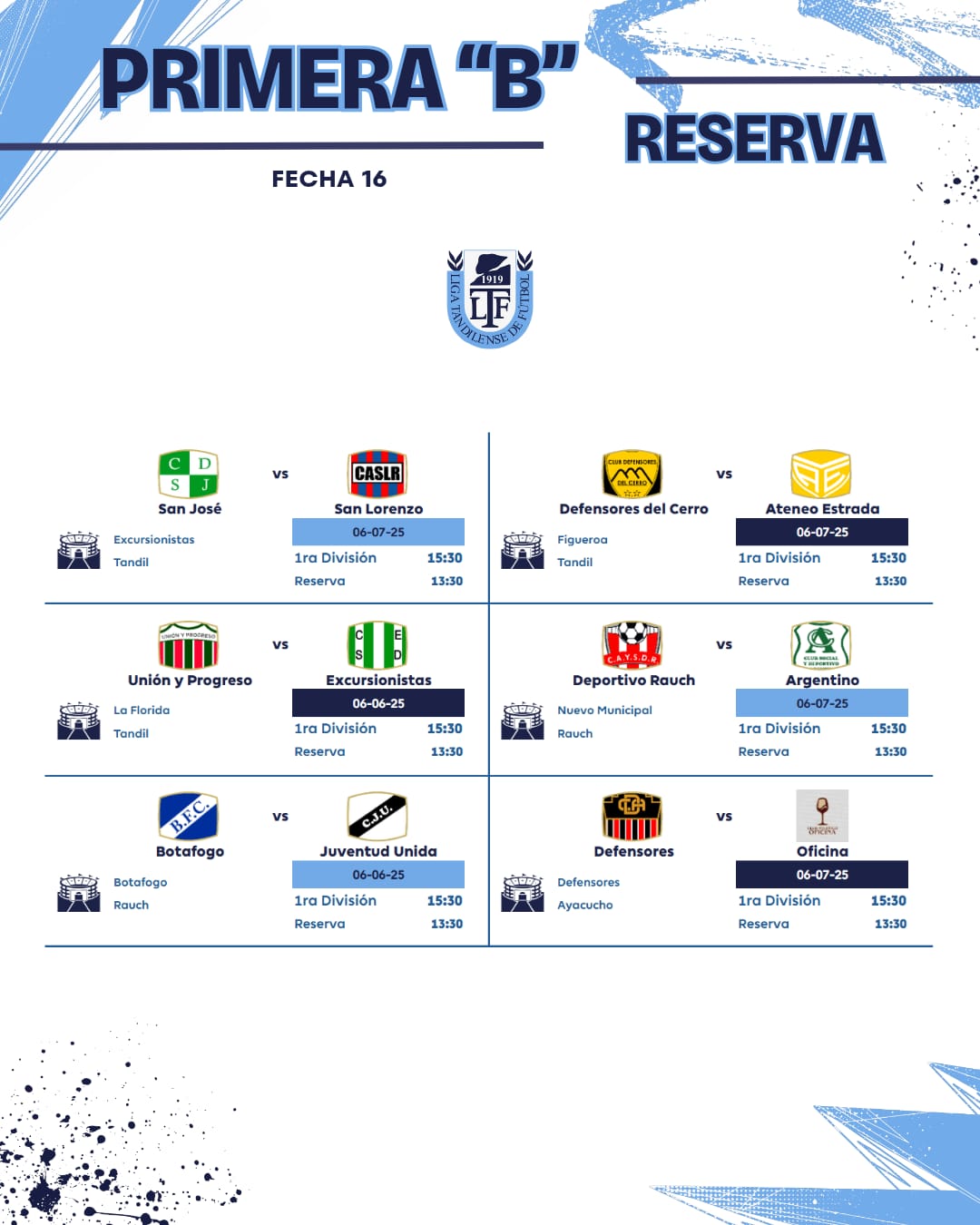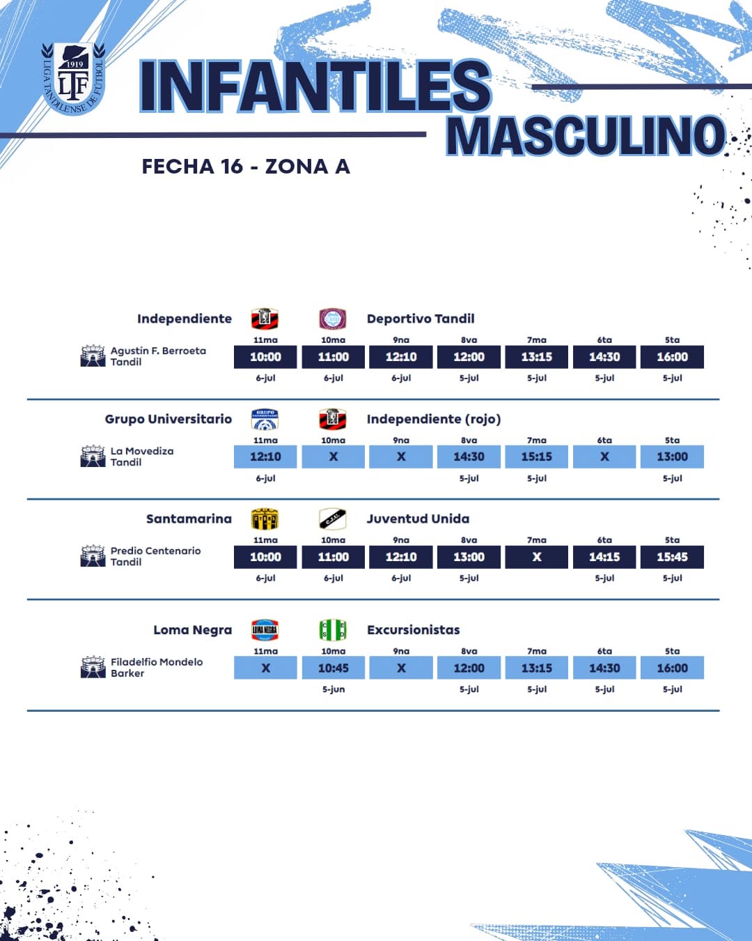Se juega la fecha 16ta de la URD – Toda la programación / Este domingo transmite la 95.3 6 julio, 2025 Pablo Tusq Deportes, deportes DIA, destacados 0 Este fin de semana se jugará la fecha 16 de la Unión Regional Deportiva. El jueves, en el estadio Gral. San Martín, se jugará una Reserva entre Independiente Rojo y Ferro. Aquí el detalle de toda la jornada; X