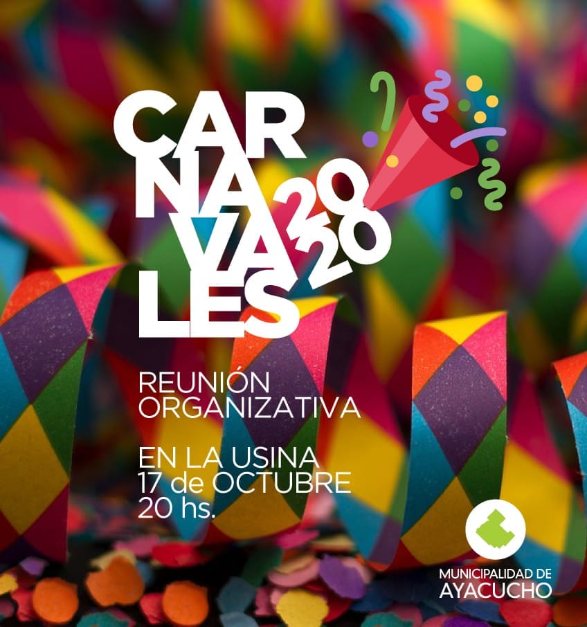 La Municipalidad de Ayacucho a través de la Dirección de Cultura invita a todas las agrupaciones artísticas, entidades intermedias, juntas vecinales y público en general interesado, a formar parte de la primera reunión organizativa referida a los Carnavales 2020… La convocatoria es para este jueves 17 de octubre desde las 20 horas en la Vieja Usina.