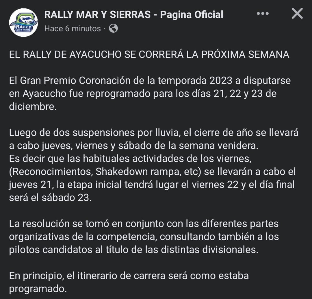 Dadas las últimas lluvias y un pronóstico que no es favorable para el fin de semana venidero, desde el Rally mar y Sierras anunciaron que fue reprogramado el Gran Premio Coronación que se iba a disputar en nuestra ciudad desde este viernes 15 al domingo 17, siendo la nueva fecha el jueves 21, viernes 22 y sábado 23l, ya como última instancia.