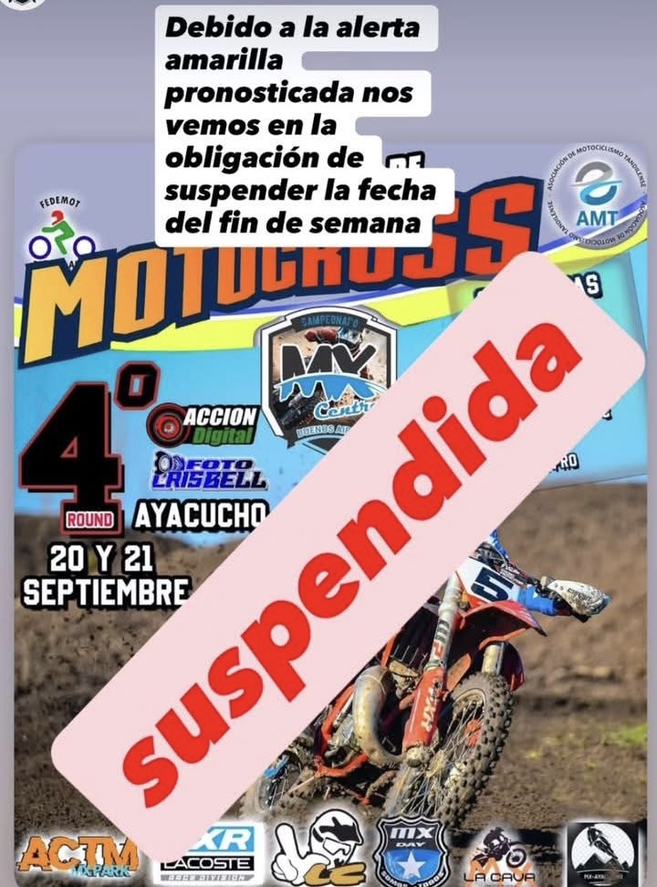 Como consecuencia de una alerta meteorológica para el sábado donde se aguardan lluvias de importancia, las autoridades del Motocross local tomaron la determinación de postergar el desarrollo de la competencia prevista para este fin de semana, para el venidero sábado 27 y domingo 28.