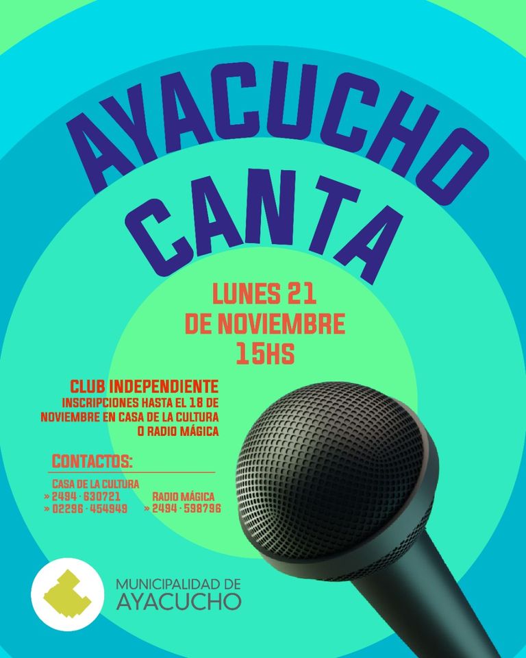 Se viene una nueva edición de Ayacucho Canta – Este lunes 21 en Independiente 18 noviembre, 2022 Pablo Tusq Locales, locales DIA 0 Si te gusta cantar, esta es la oportunidad para compartir una jornada a toda voz!!! Este lunes 21 de noviembre, a partir de las 15 horas, en el Anfiteatro del Centro Recreativo Comunal Club Independiente. Para participar solo debes inscribirte en Casa de la Cultura o en radio Mágica. Hasta el viernes 18 tenés tiempo!!! Es libre y gratuito!!! Organiza Dirección de Cultura Municipalidad de Ayacucho y Fmmagica Ayacucho X
