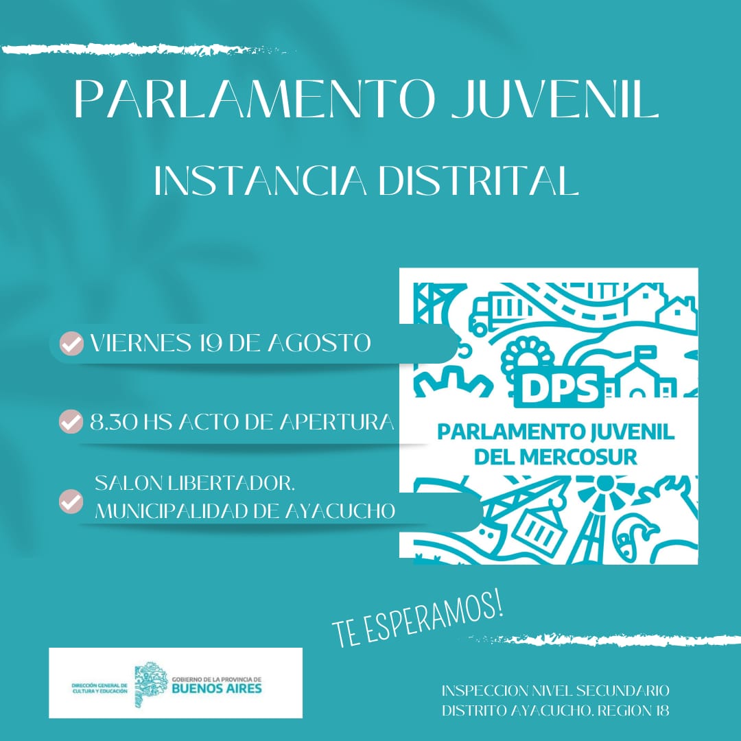El venidero viernes 19 de Agosto se llevará a cabo una nueva edición del Parlamento Juvenil del Mercosur en su instancia distrital. El mismo se llevará a cabo en las instalaciones del Salón Libertador General San Martín, donde el acto de apertura será a las 8.30 horas.