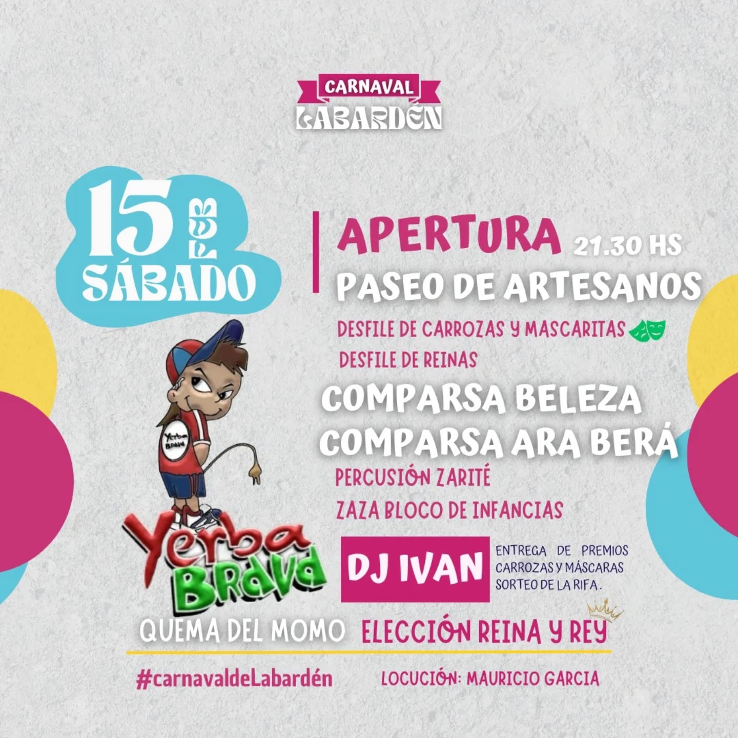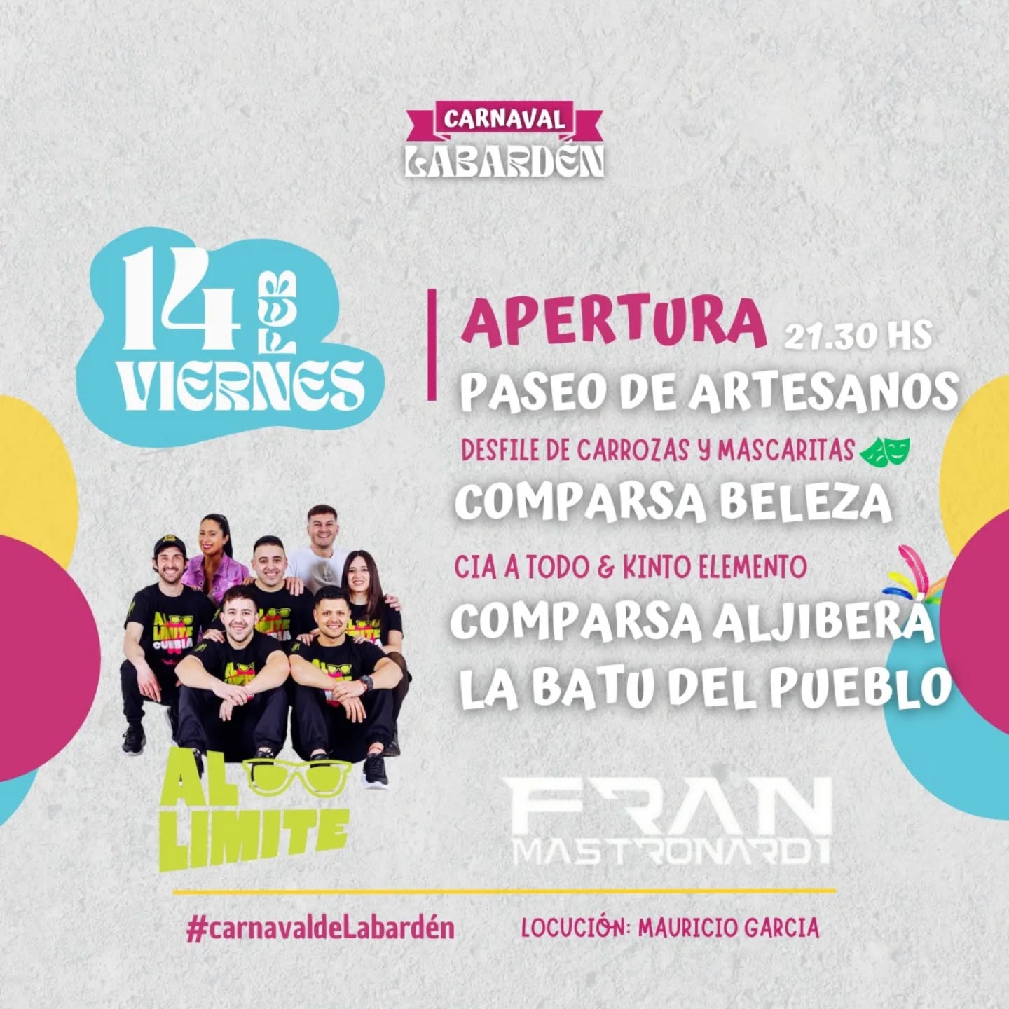 Descripción: La apertura será el viernes con la comparsa local Beleza. Se presentarán también La Batu del Pueblo y la Comparsa Aljiberá. Además, habrá baile con Al Limite Cumbia y DJ Mastronardi. El sábado pasará nuevamente la comparsa local Beleza y AraBera y se realizará el desfile de Reinas Visitantes y la Elección de la Reina. Actuarán Yerba Brava y DJ Iván. Quema del Momo. Entrada gratuita. Organiza la Municipalidad General Guido y la Delegación Municipal de Labardén.