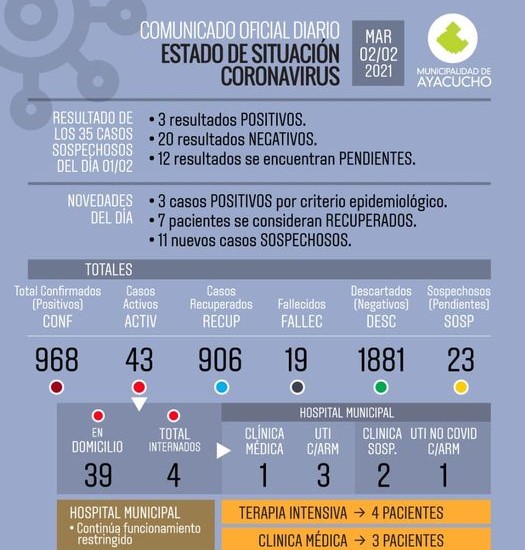 Este martes 2 de Febrero se registraron 6 nuevos casos positivos de Coronavirus, de los cuales 3 fueron por criterio epidemiológico. Y teniendo en cuenta que 7 pacientes cumplieron su plazo y se los considera recuperados, el número de activos llegó a 43, que son quienes aún están cursando la enfermedad.