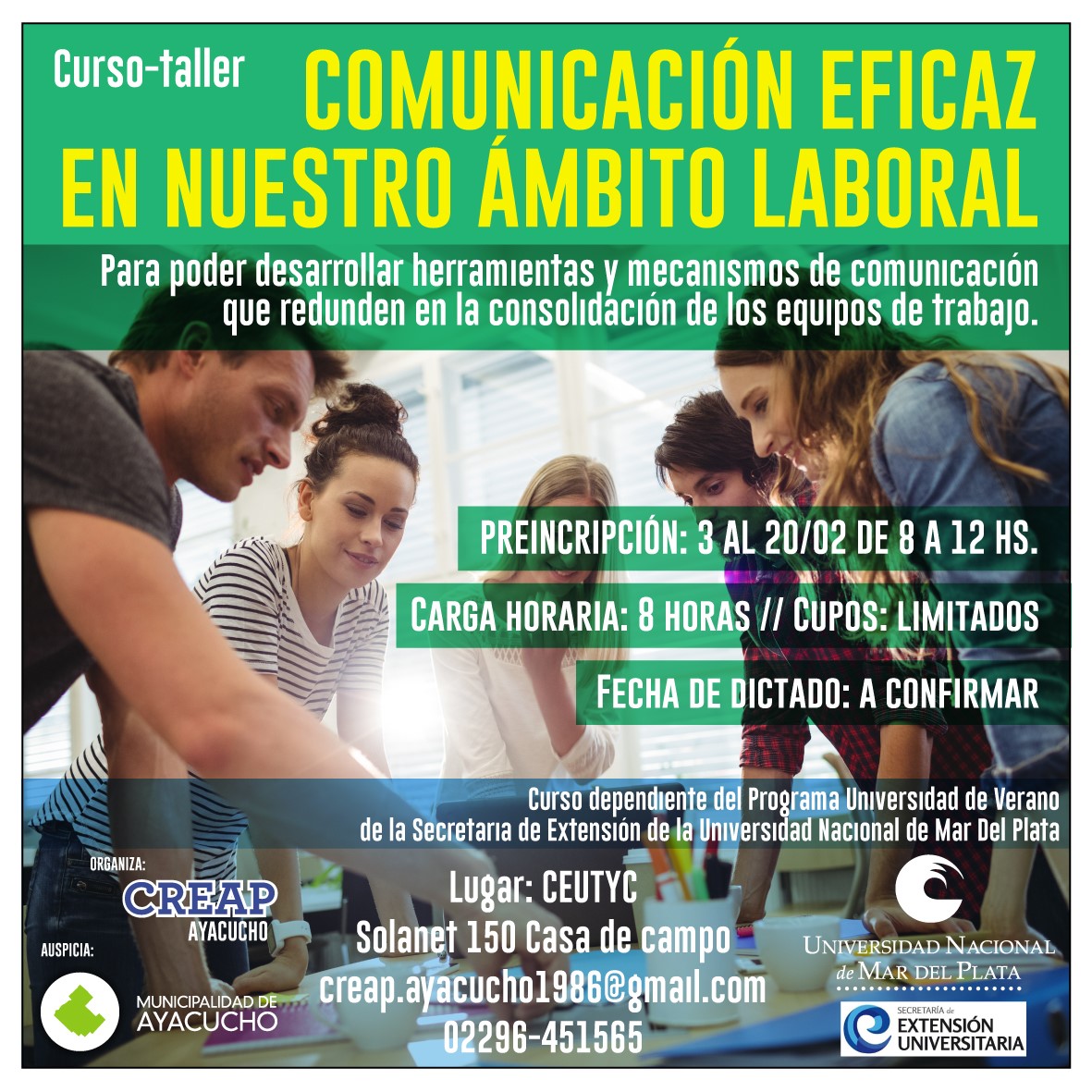 La pre-inscripción se realiza en la sede del CREAP, ubicada en Av. Solanet Nº 150, de lunes a viernes en horario de 8 a 12. También pueden consultar por mail a creap.ayacucho1986@gmail.com