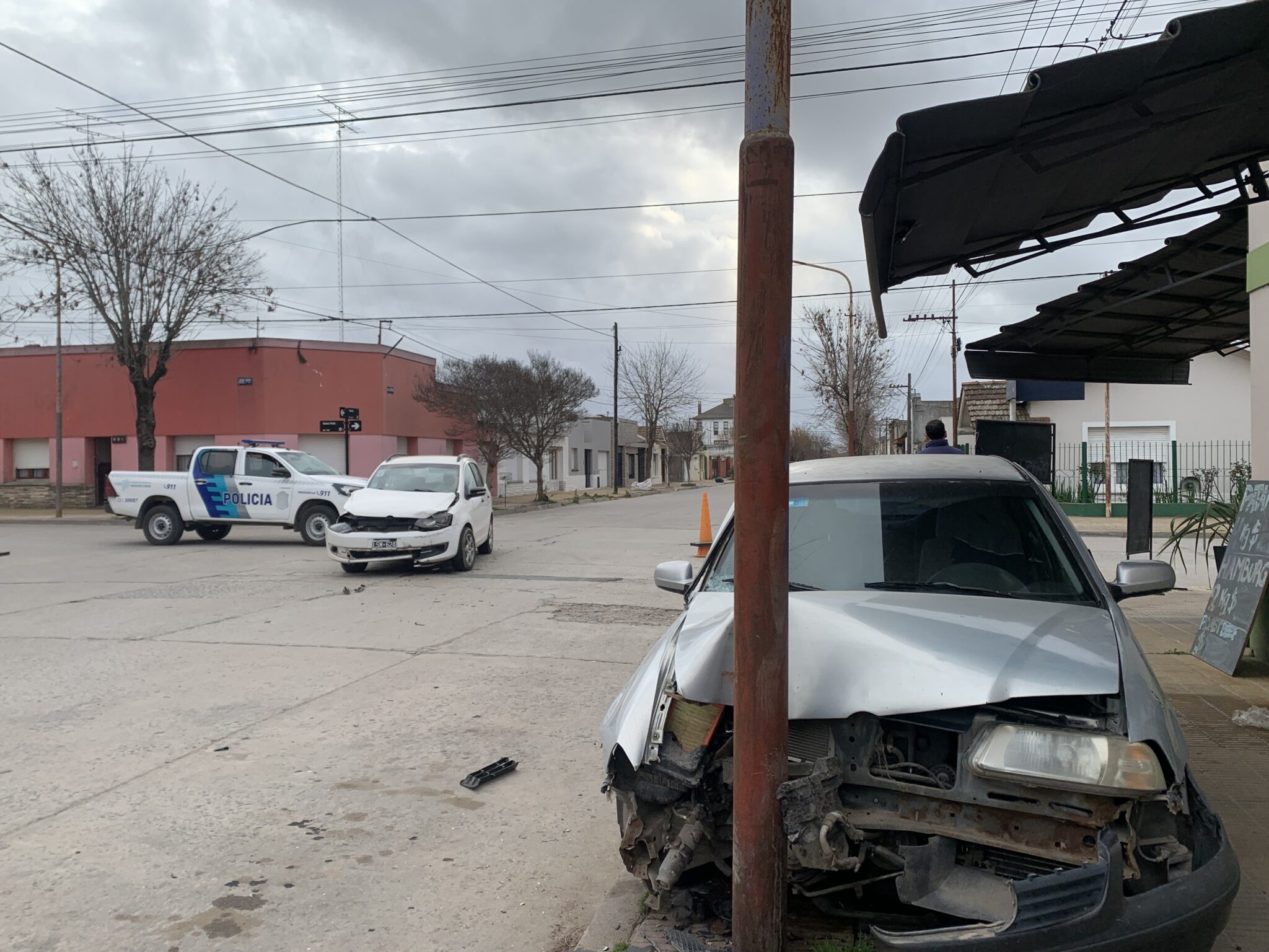Uno de los vehículos terminó arriba de la vereda, chocando el poste de la luz ubicado sobre la misma.