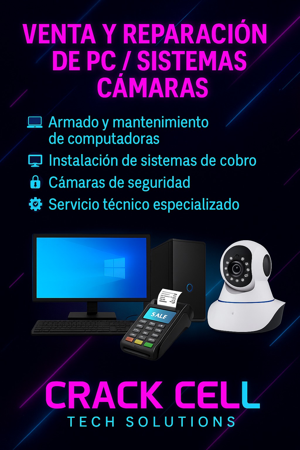 Todo en tecnología, trabajos con garantía, promos de celulares a $ 100.000.-, armado y mantenimiento de PC, sistemas de cobro, cámaras de seguridad, pedido de repuestos y mucho más…