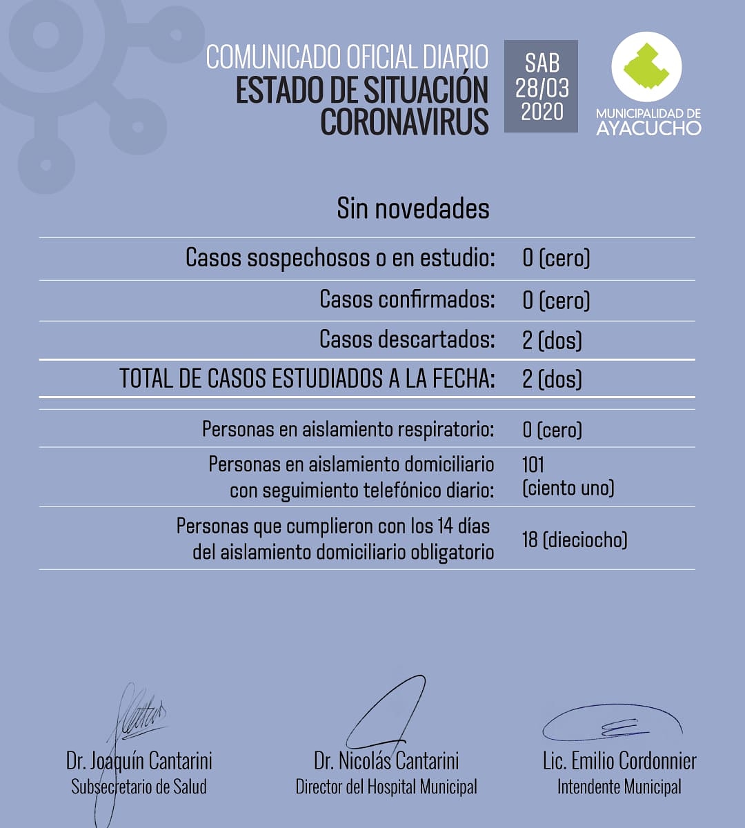 Sin novedades en el informe oficial por Coronavirus este Sábado 28