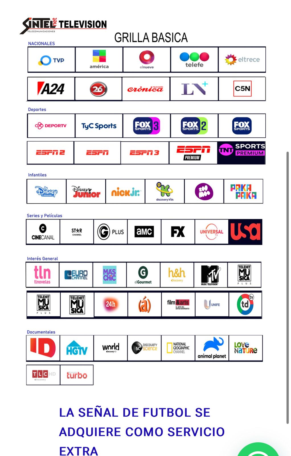 Consultá en la página de SintelNet.com.ar toda la grilla de canales, más allá que te adelantamos que tenés TV Pública, América, el 9, Telefé, Canal 13, A24, Crónica, C5N, LN+, TycSport, 3 señales de Fox y 4 señales de ESPN, como TNT Sport Premium.