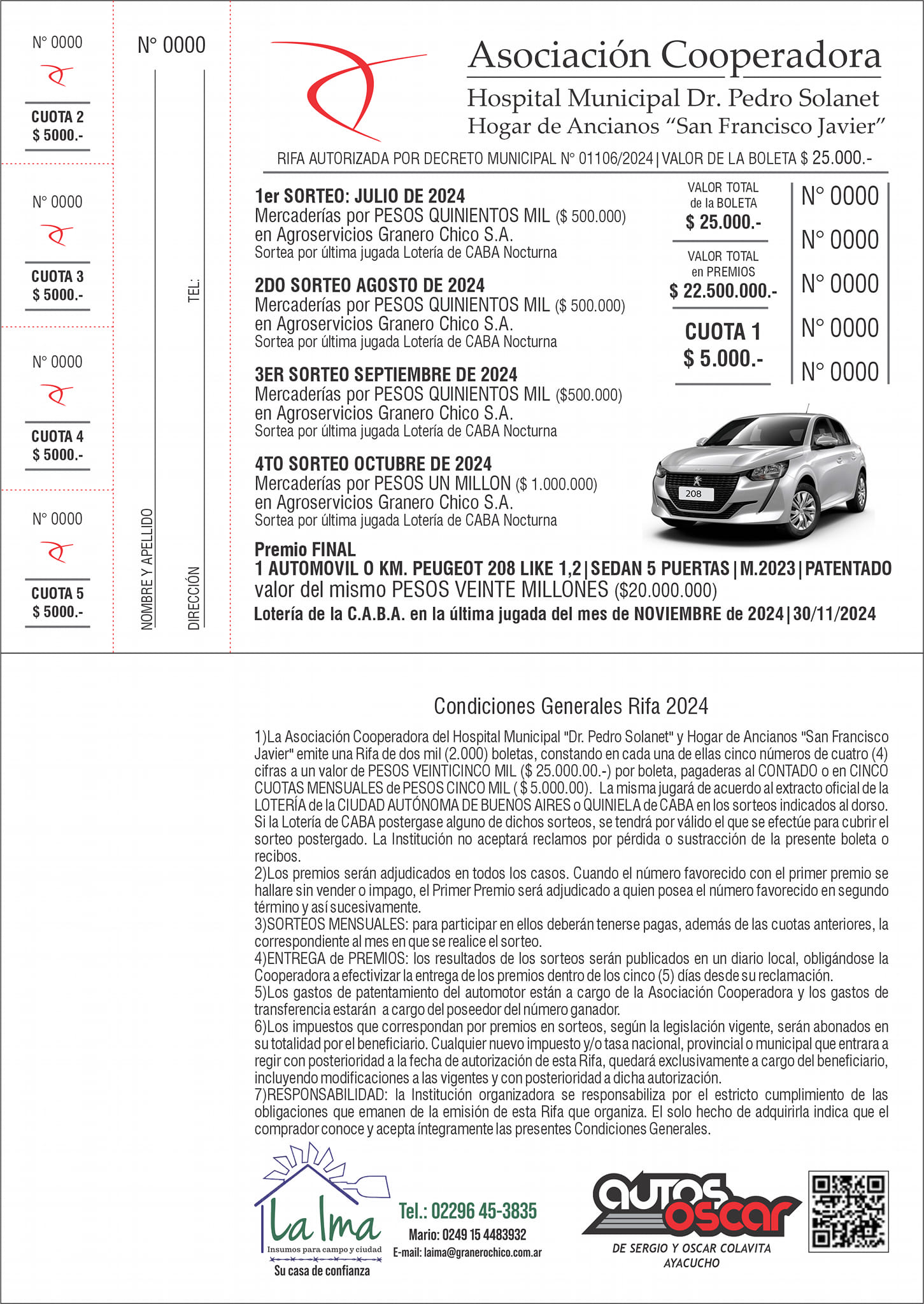 En el día de la fecha, este sábado 26 de Octubre de 2024, se realizó el cuarto Sorteo de la Rifa Anual de la Cooperadora del Hospital Municipal de Ayacucho y del Hogar de Ancianos San Francisco Javier, por Lotería Nocturna C.A.B.A., consistente en la suma de pesos 1.000.000.00.