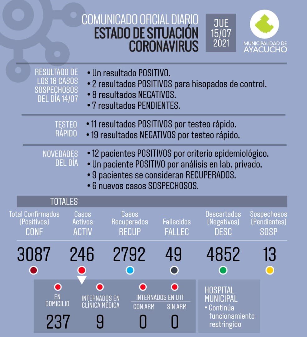 Un total de 26 nuevos contagios de Covid se registraron en las últimas 24 horas y como solo se dieron 9 recuperados, los activos treparon a 246. De ese total, 9 se encuentran internados en el Hospital Municipal en Clínica Médica.