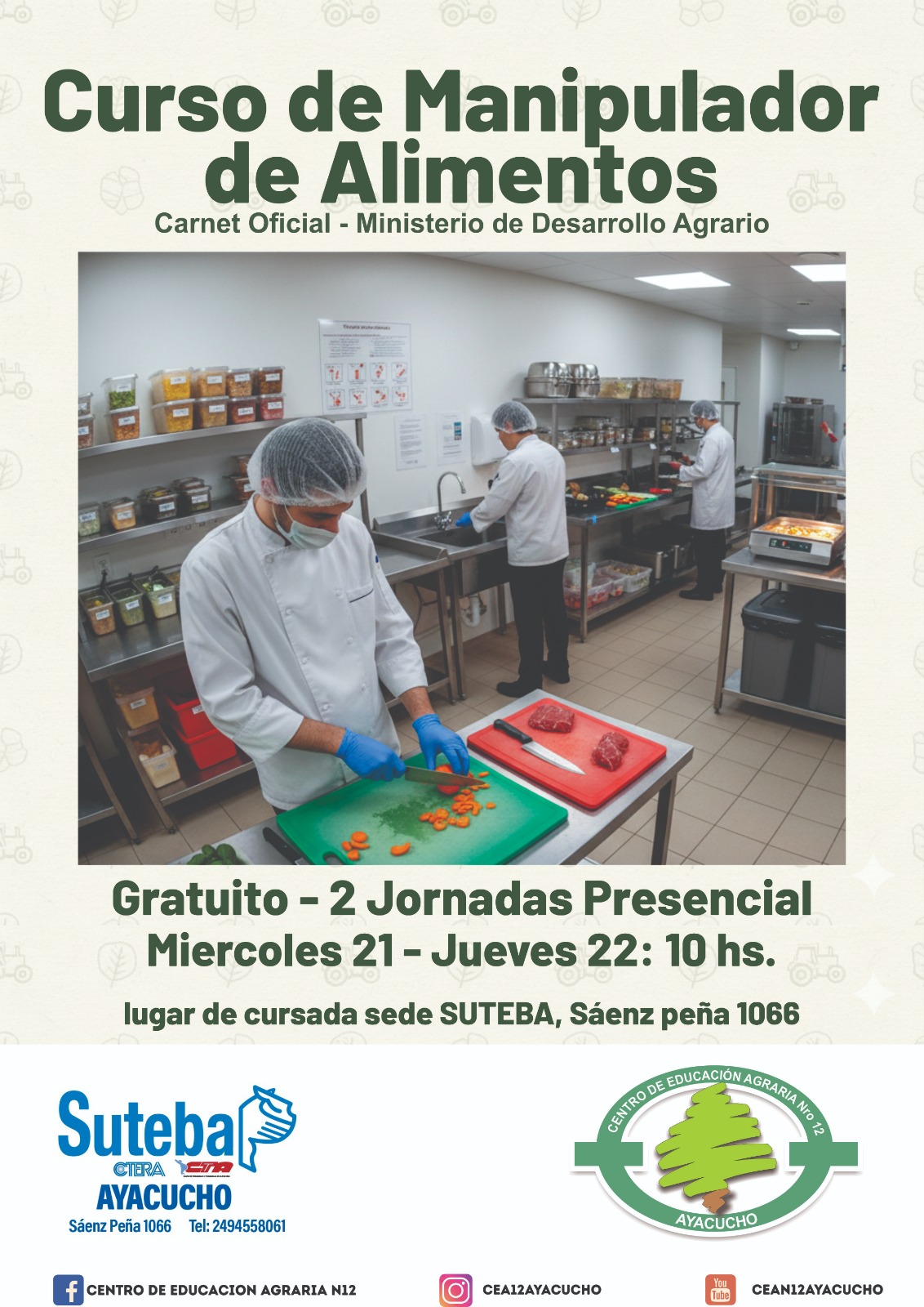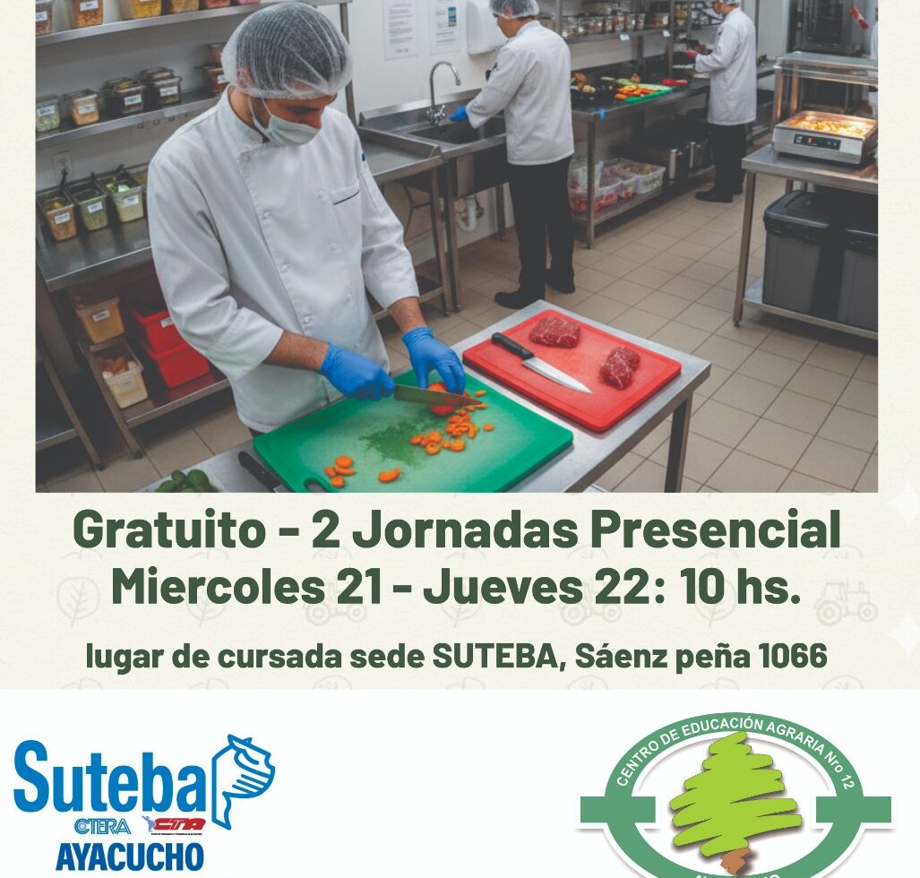 En enero continuamos ofreciendo posibilidades de formación y capacitaciones. En conjunto con el CEA N 12 los días 21/1 y 22/1 a las 10 horas en nuestra sede de calle Sáenz Peña 1066 se dictará el curso de Manipulación de alimentos, dependiente del Ministerio de Desarrollo Agrario de la provincia de Buenos Aires. El mismo es abierto a la comunidad, afiliados y no afiliados.