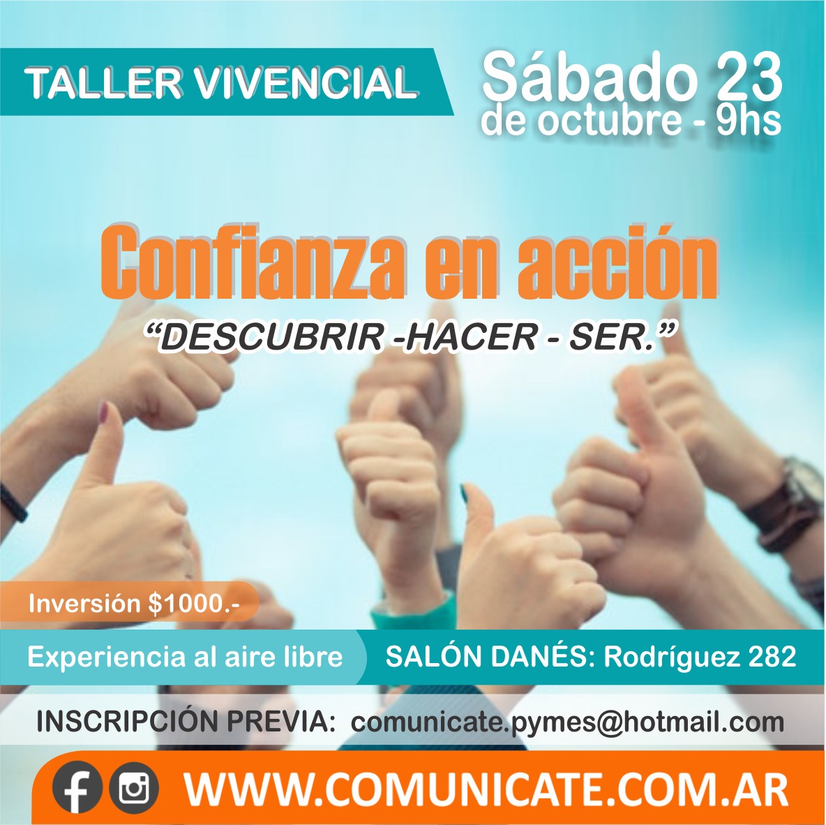 El venidero sábado 23 de Octubre se concretará una nueva propuesta de Comunicate Consultora. Se trata de una una experiencia vivencial al aire libre, para “DESCUBRIR, HACER, SER quien quieras ser”.