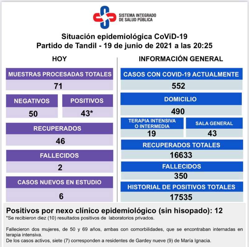 El reporte sanitario emitido este sábado por el Sistema Integrado de Salud (SISP) sobre la situación del coronavirus Covid-19 en el partido de Tandil, informó la muerte de dos mujeres, de 50 y 69 años, que se encontraban internadas en terapia intensiva. Hubo 46 pacientes recuperados y que son 552 las personas cursando la enfermedad.