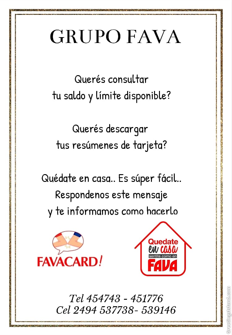 Adherite a www.favacard-online.com.ar y podrás ver tus resúmenes, límites y consumos de tu tarjeta. Para consultas con tu sucursal comunícate al 2494-537738.